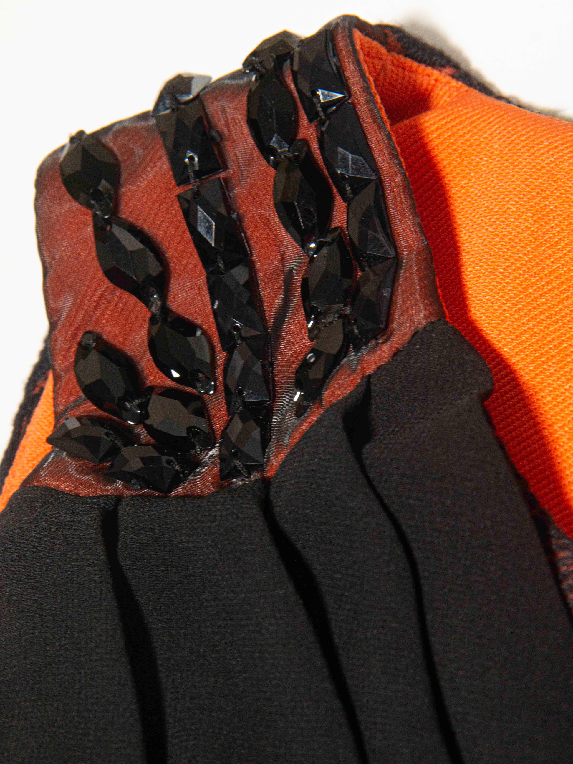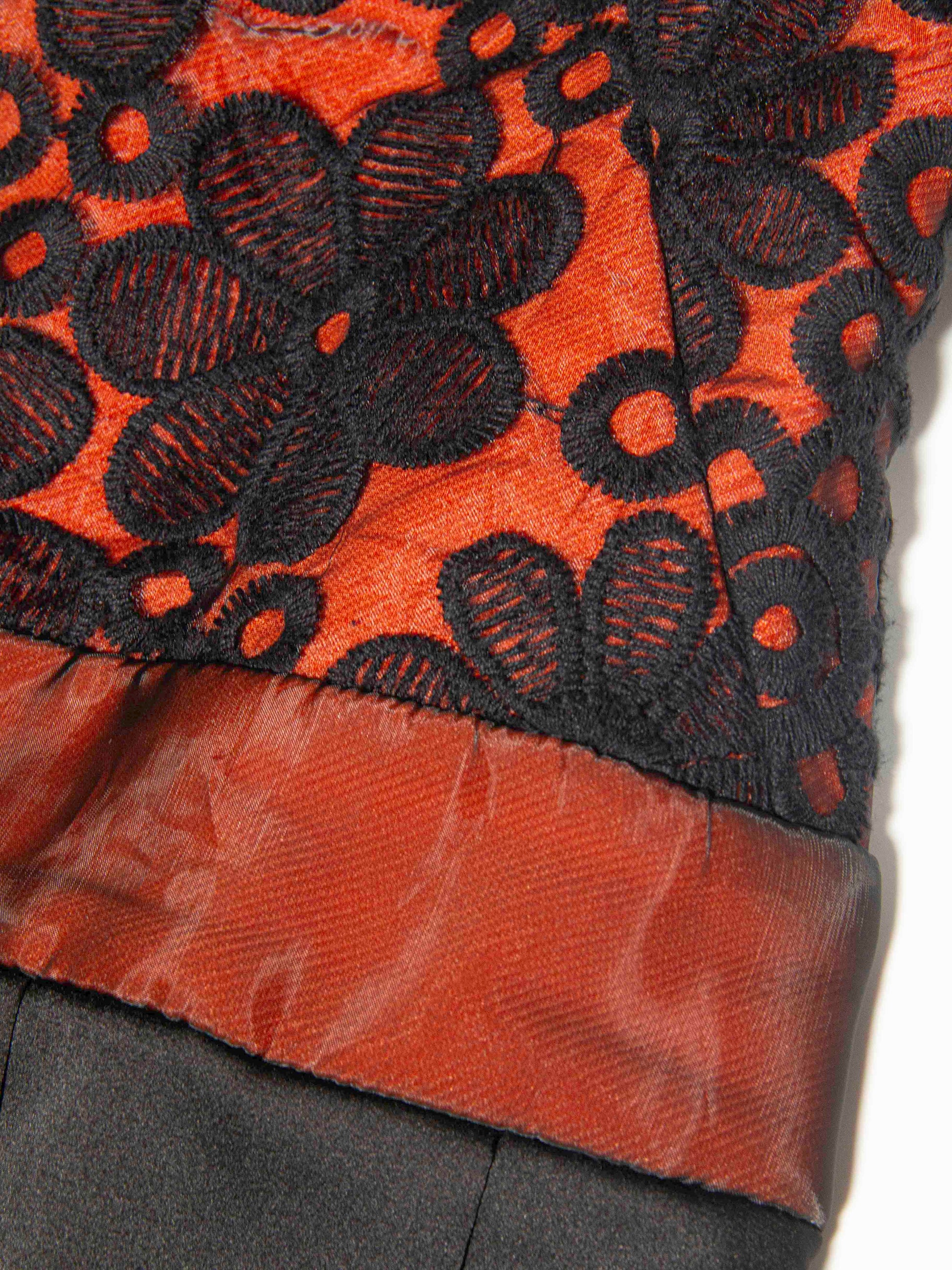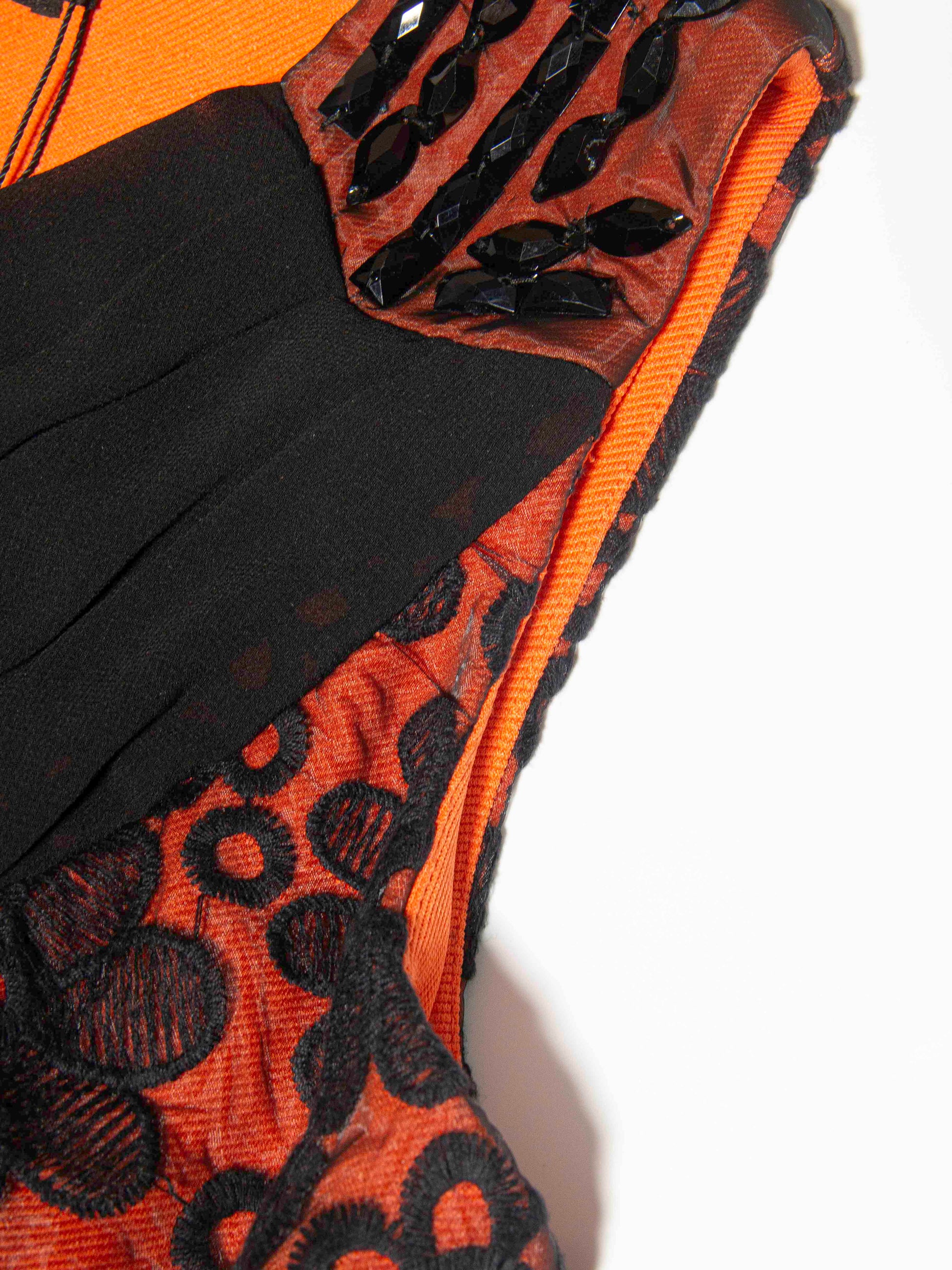 Details: Black embroidered flowers over a vivid fire-orange base with bead accents at the shoulders