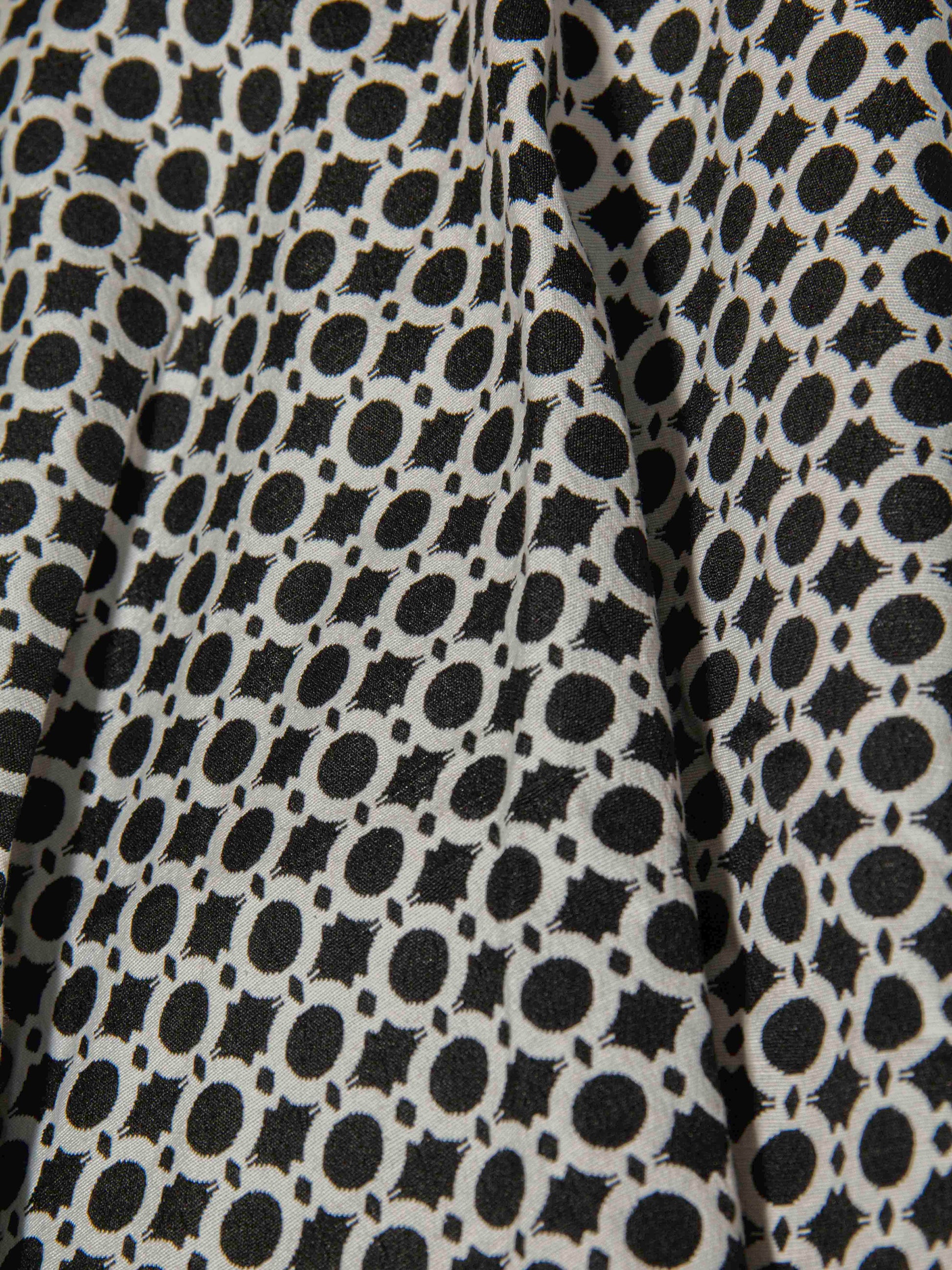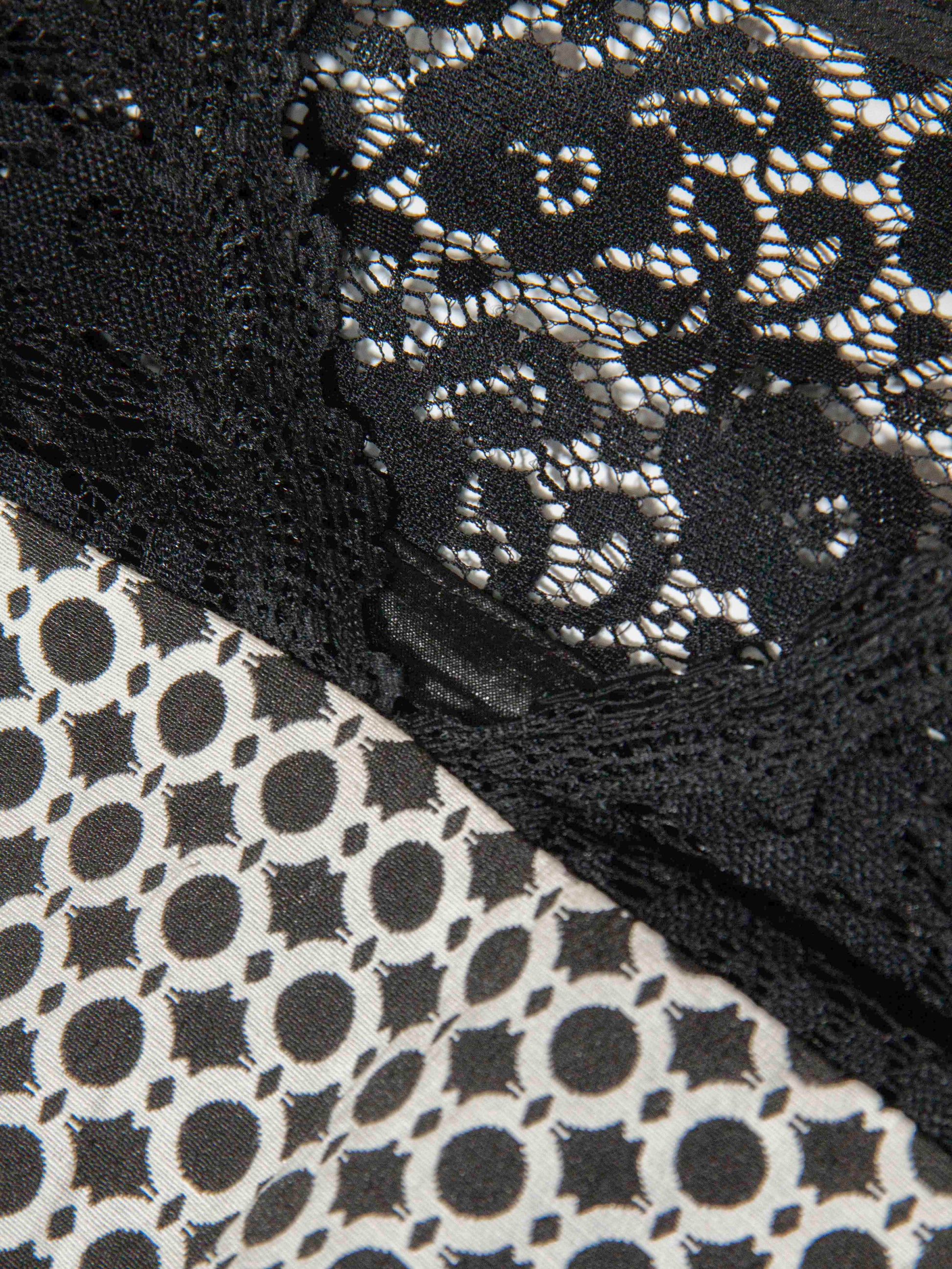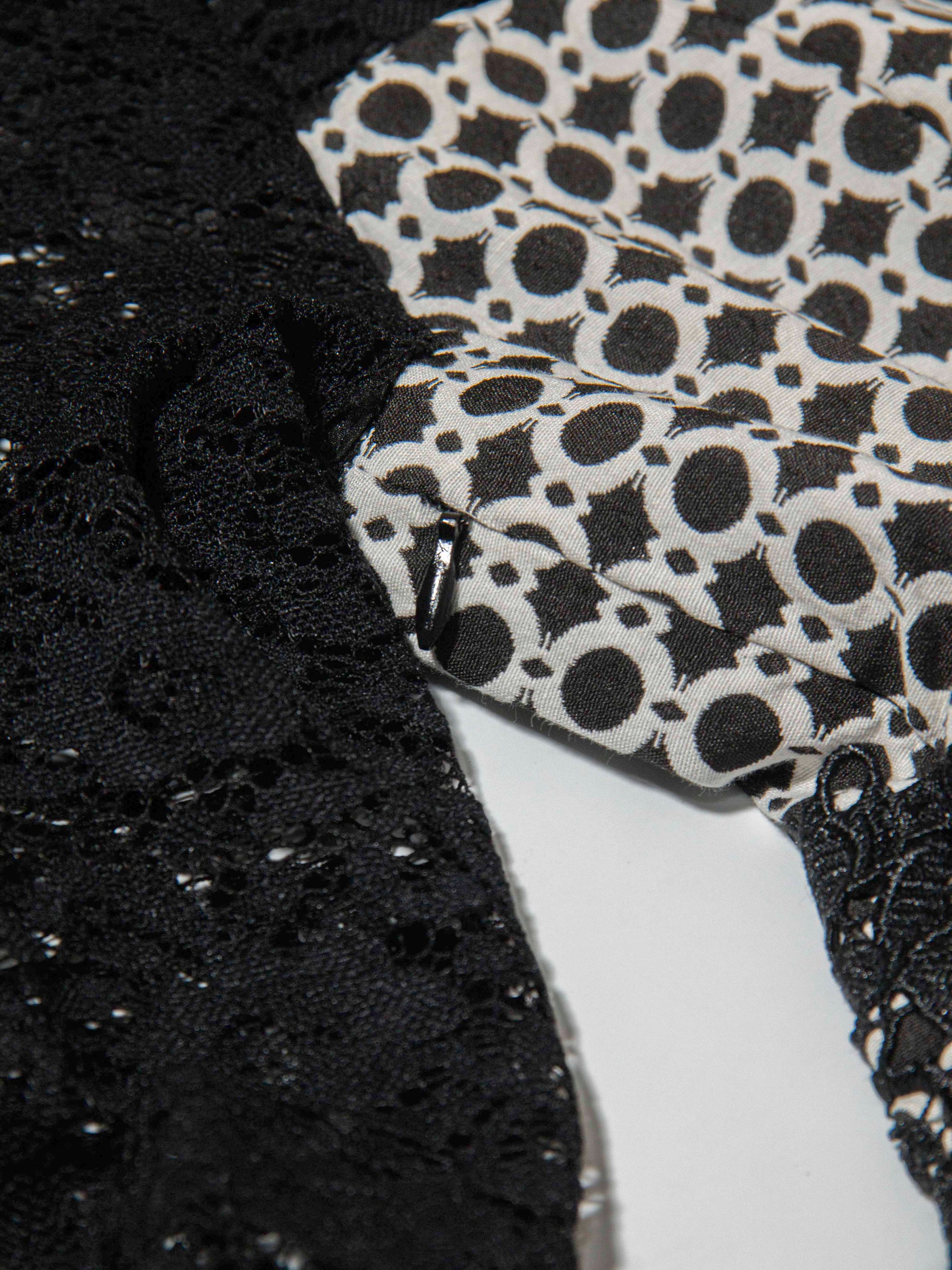 Details: Monochrome circle-and-star print with a floral lace panel cinching the waist