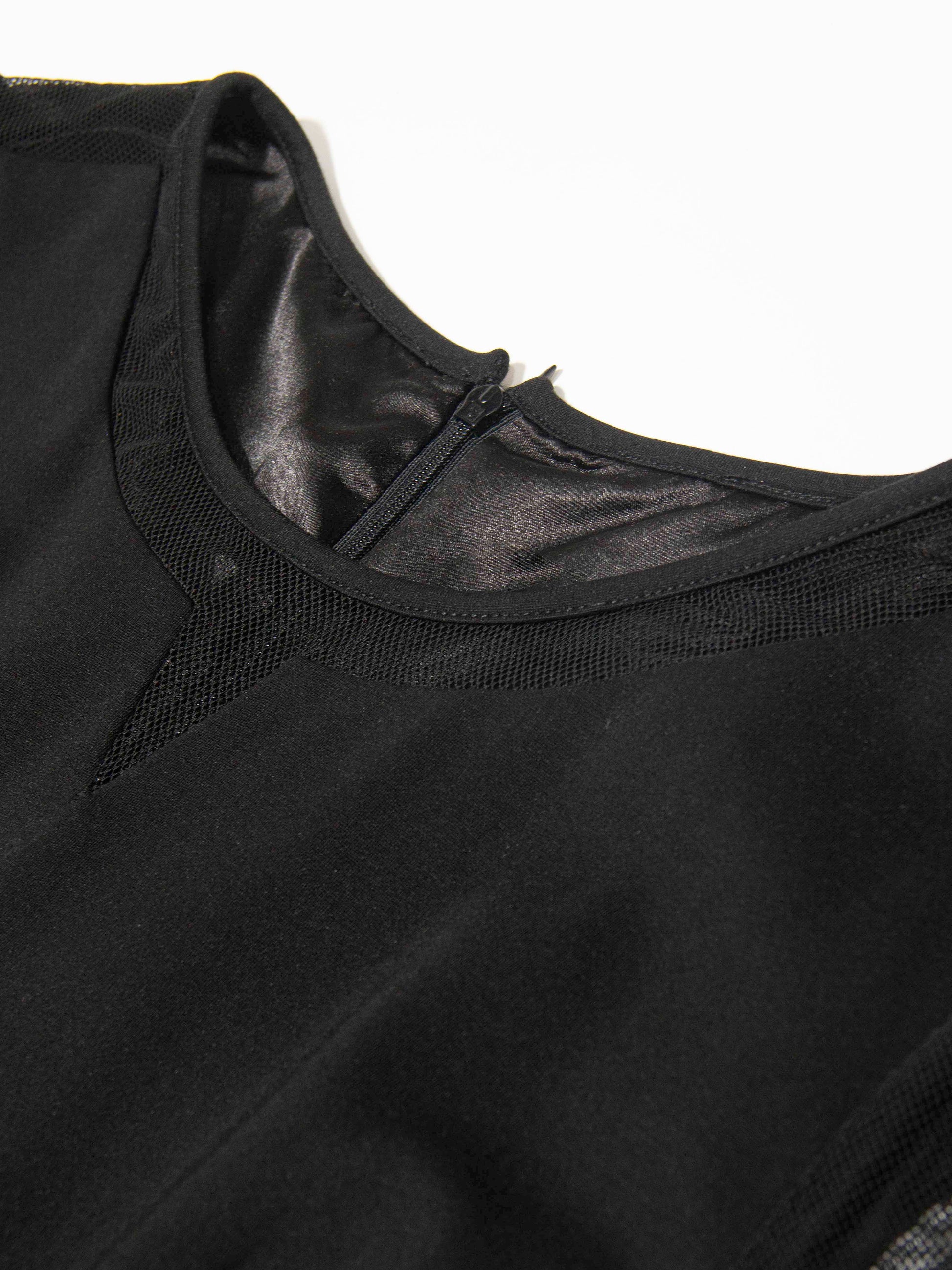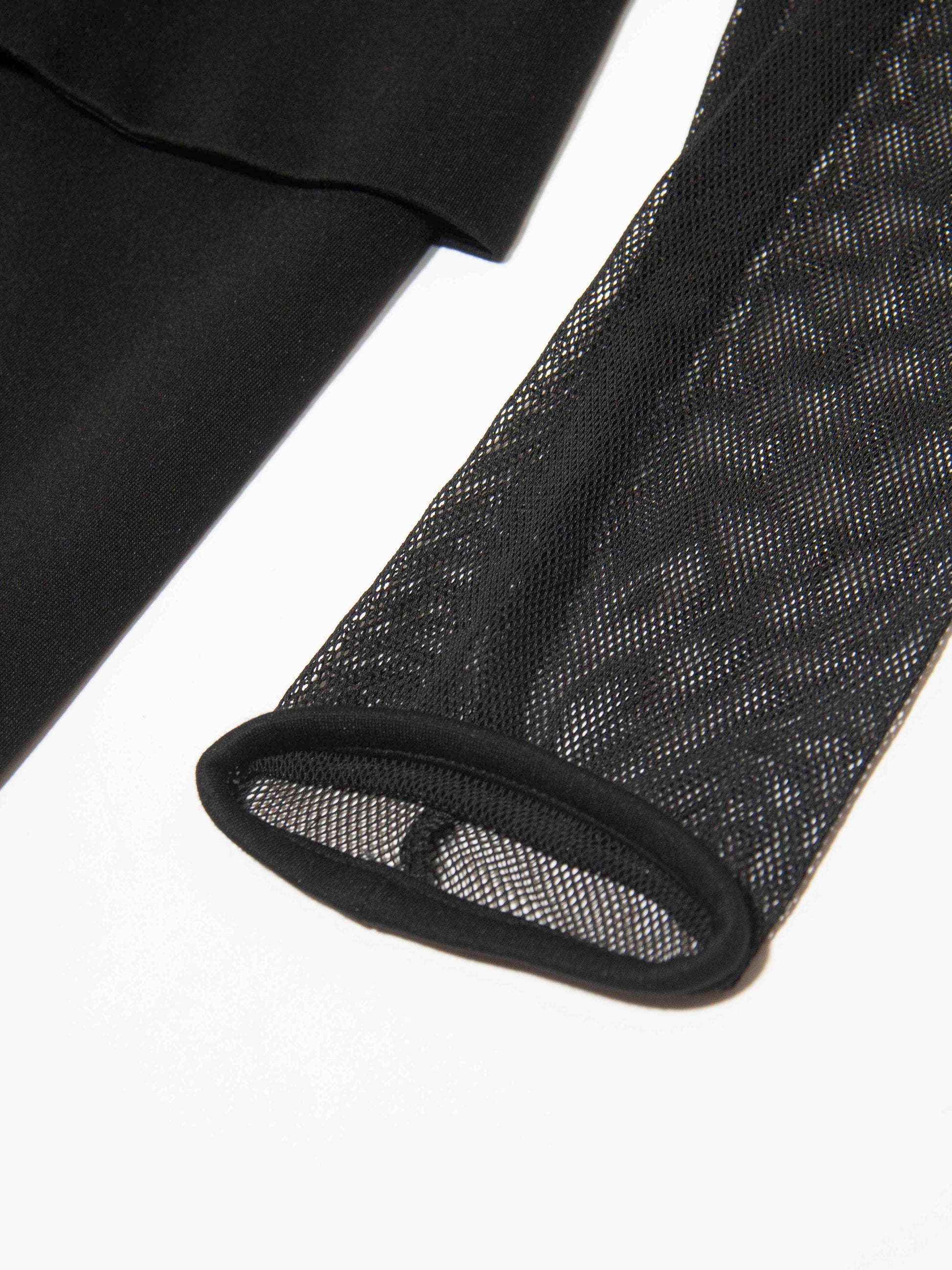Details: Clean black body with illusion mesh yoke and sleeves for a modern, polished look