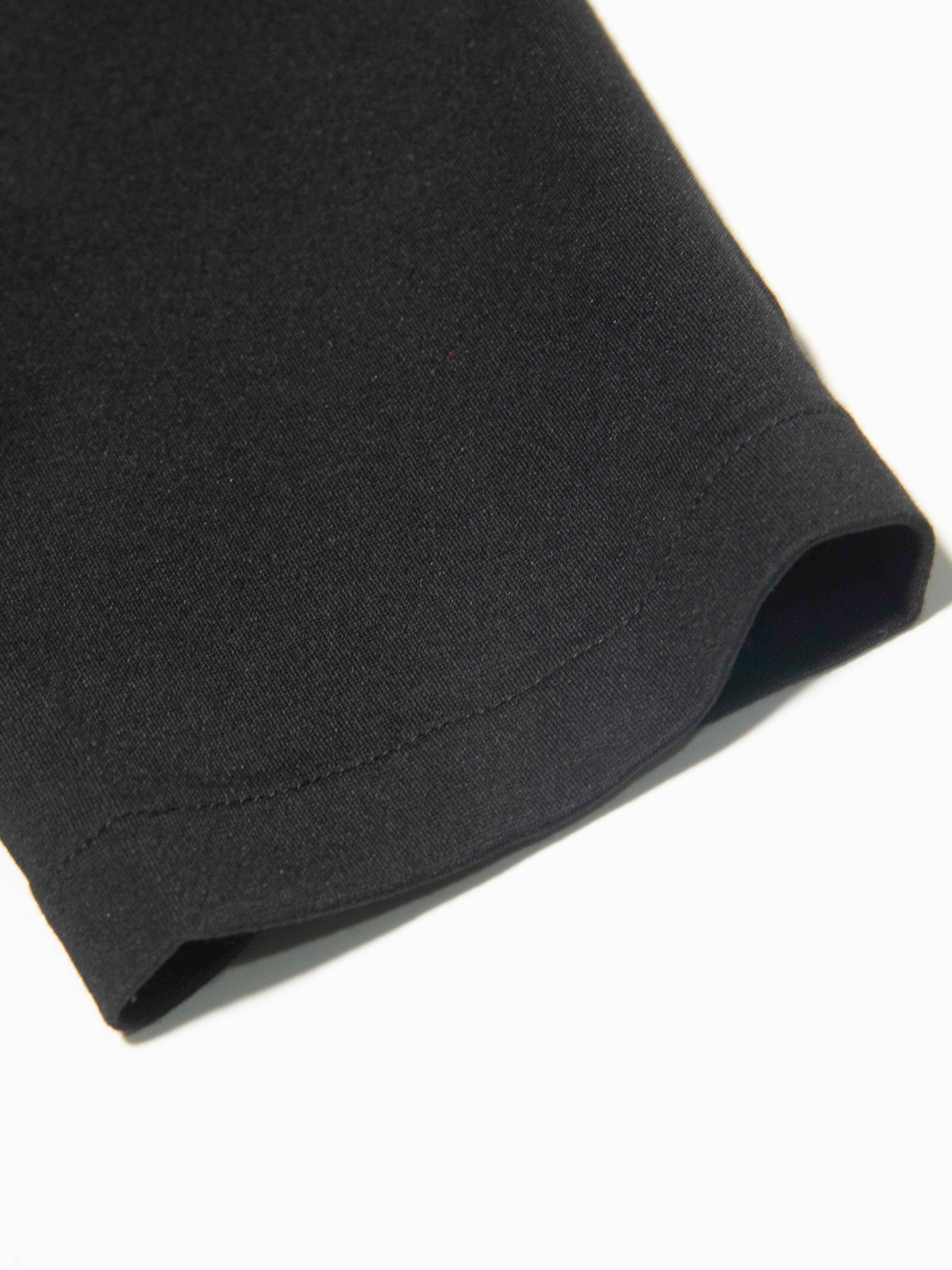 Sleeves: Full-length black sleeves that balance coverage and sophistication.