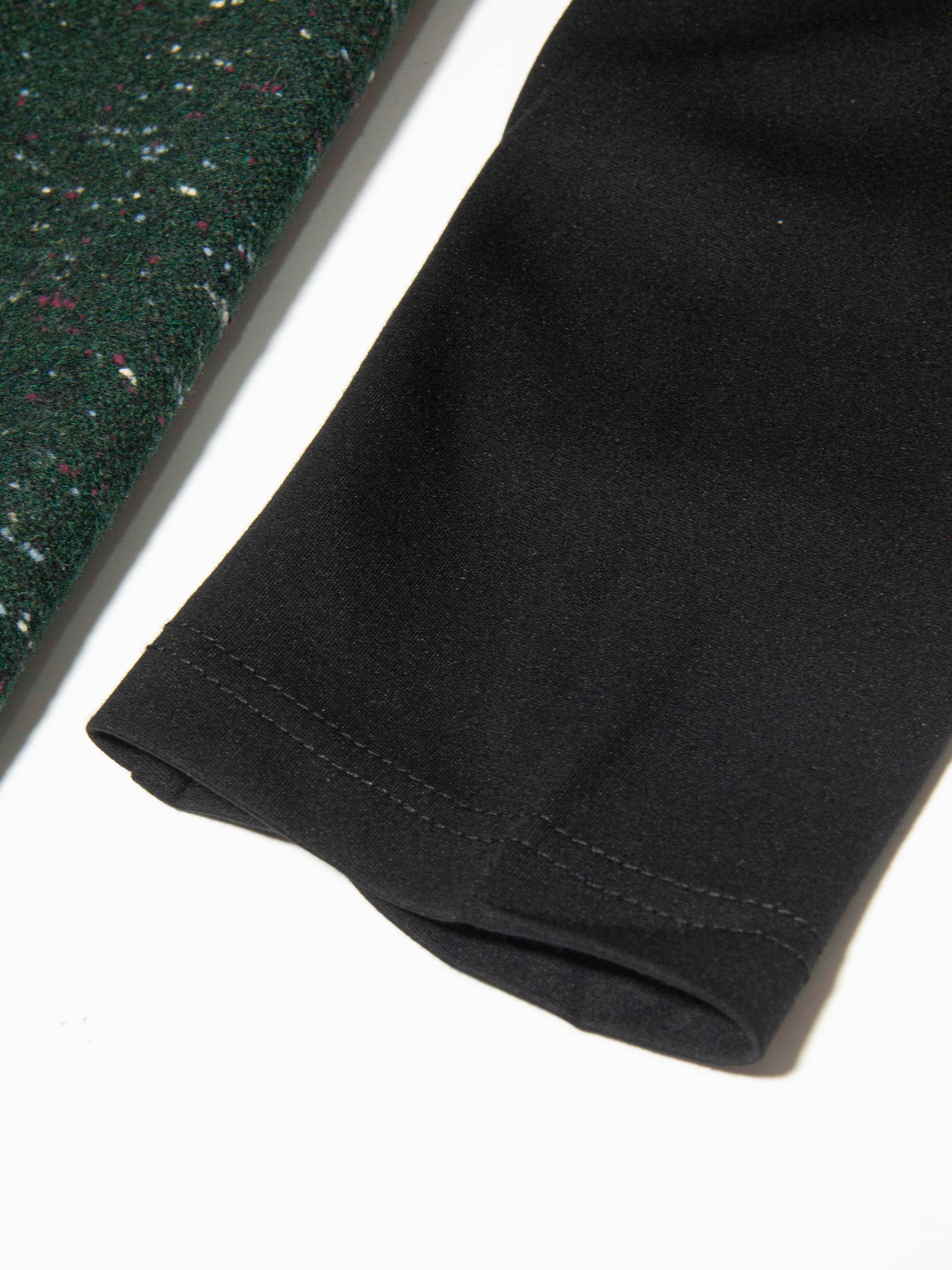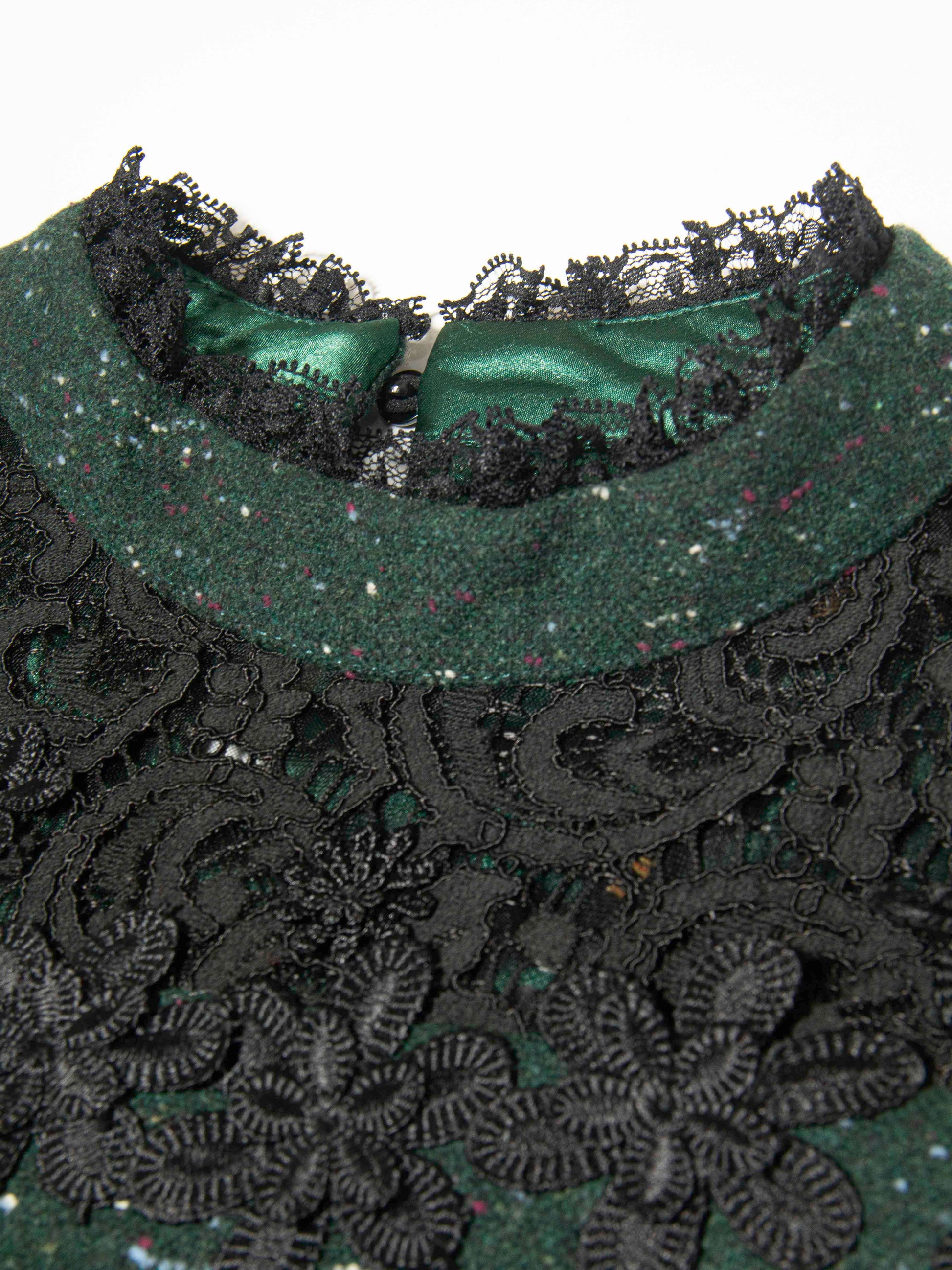 Details: Emerald speckled bodice with black floral lace overlay on the chest and shoulders, plus solid black sleeves that balance the texture and keep the look refined.