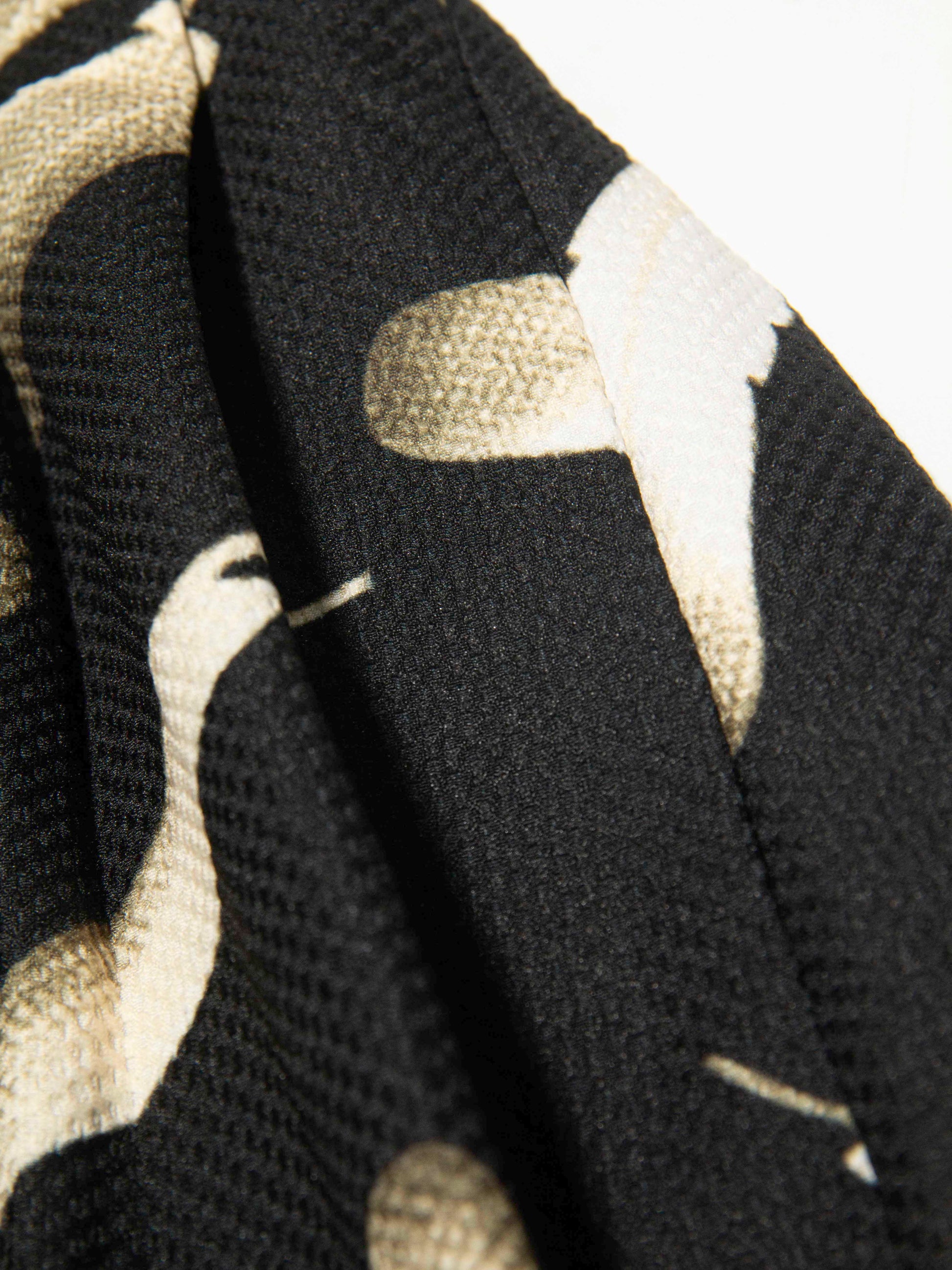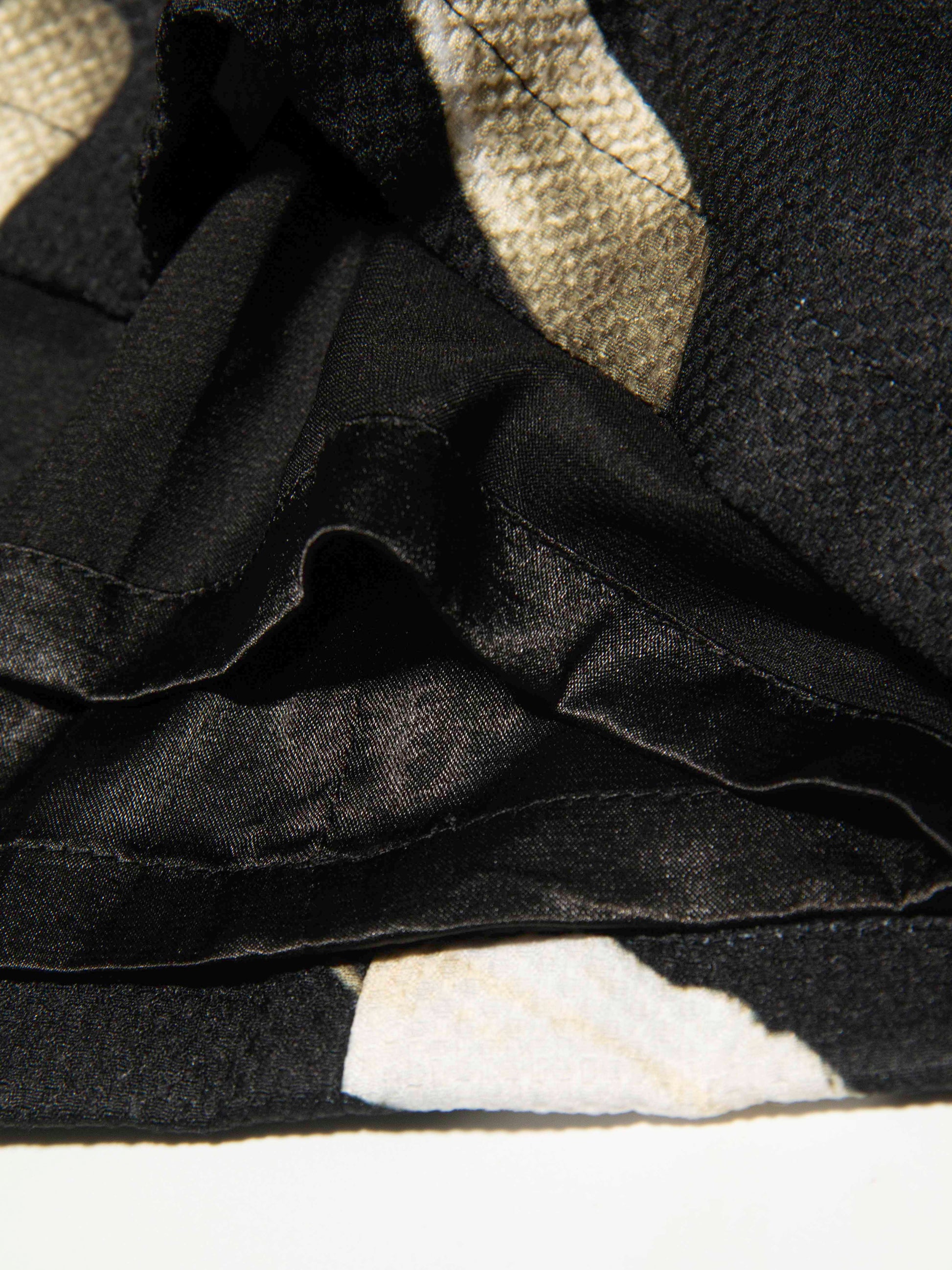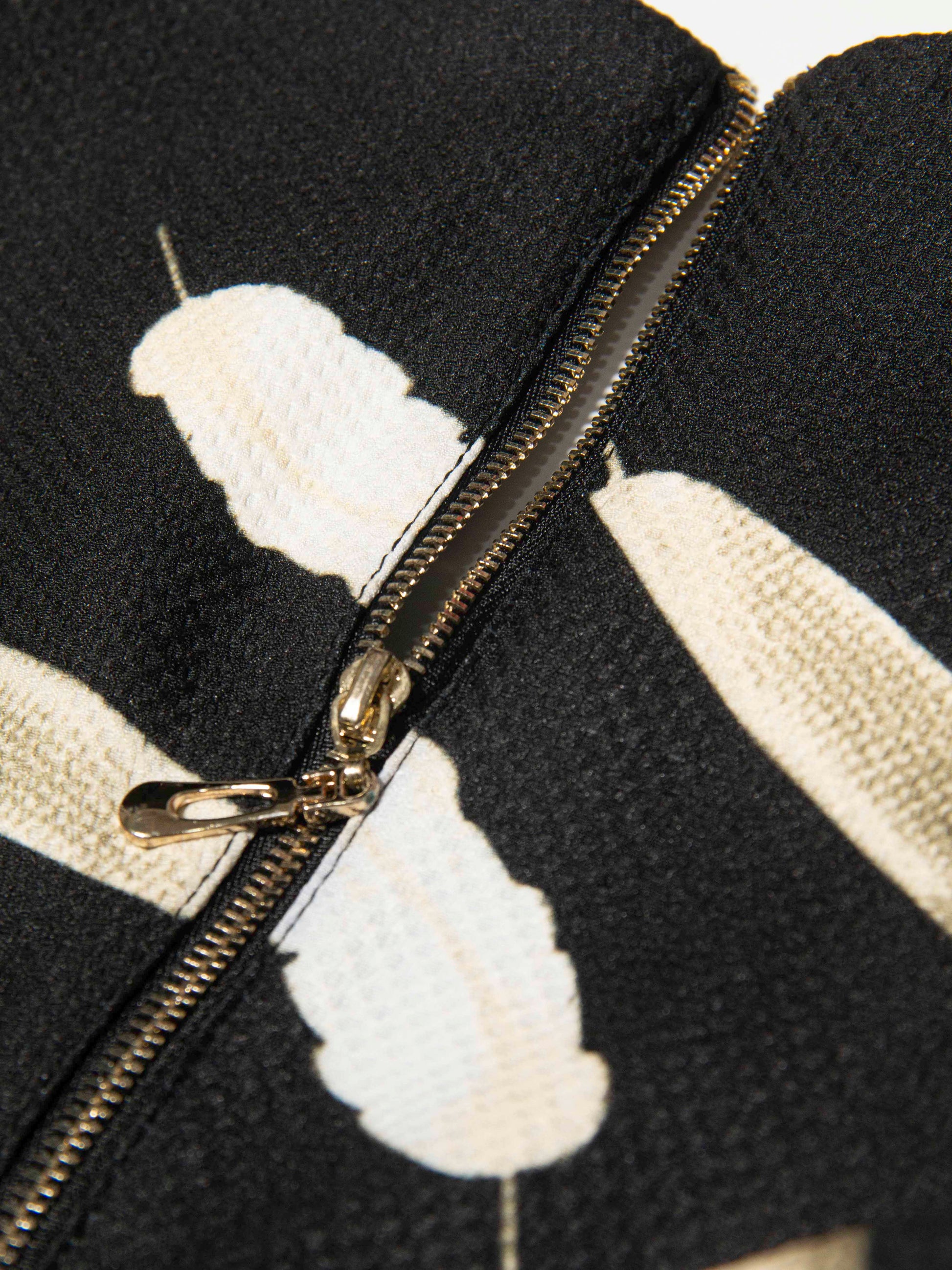 Details: Textured black fabric with metallic beige feather strokes and pleats on the skirt