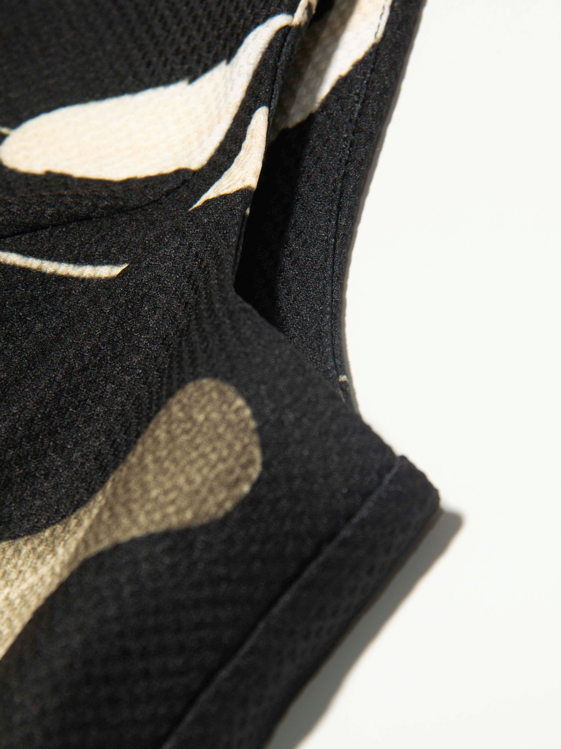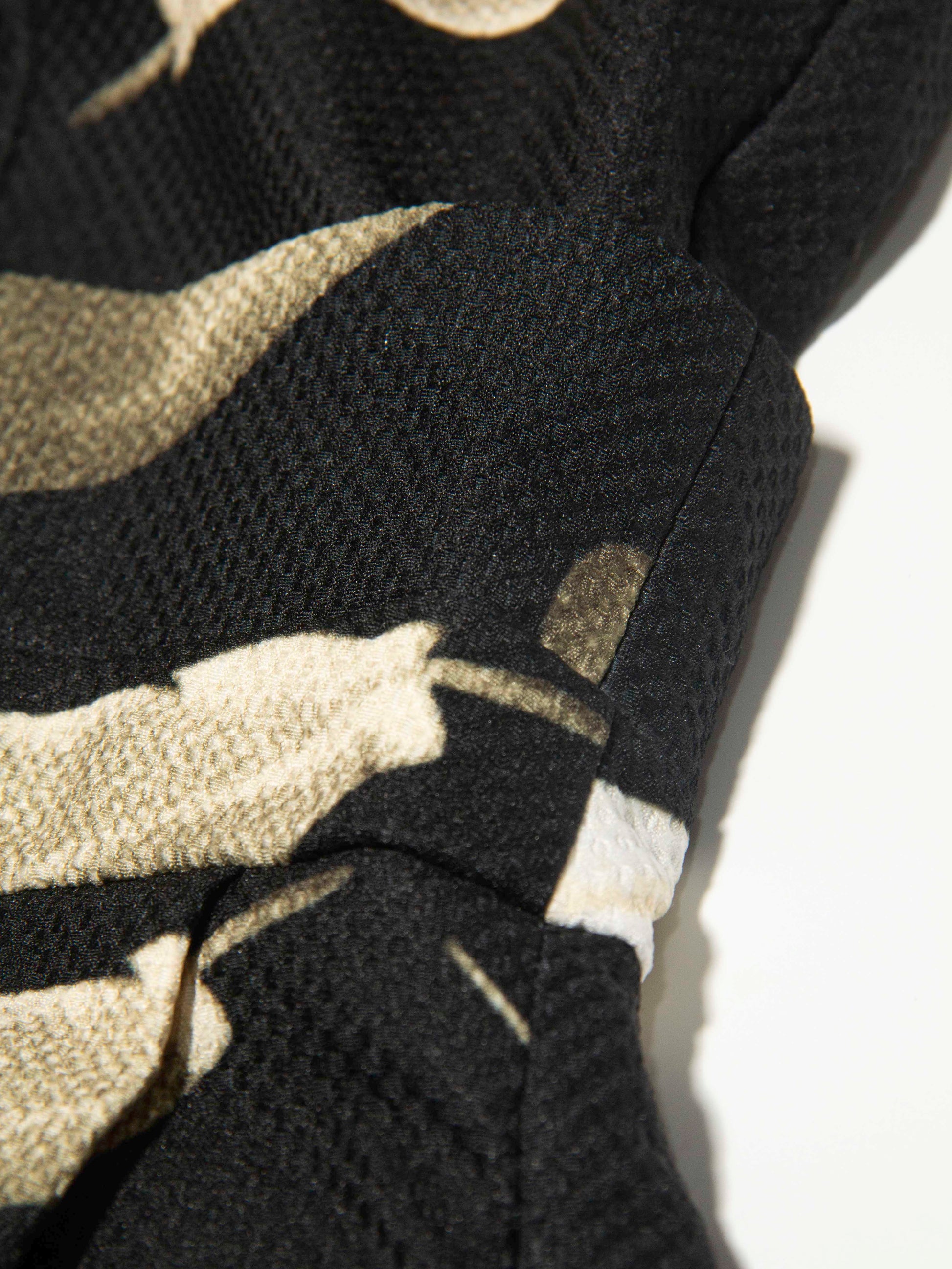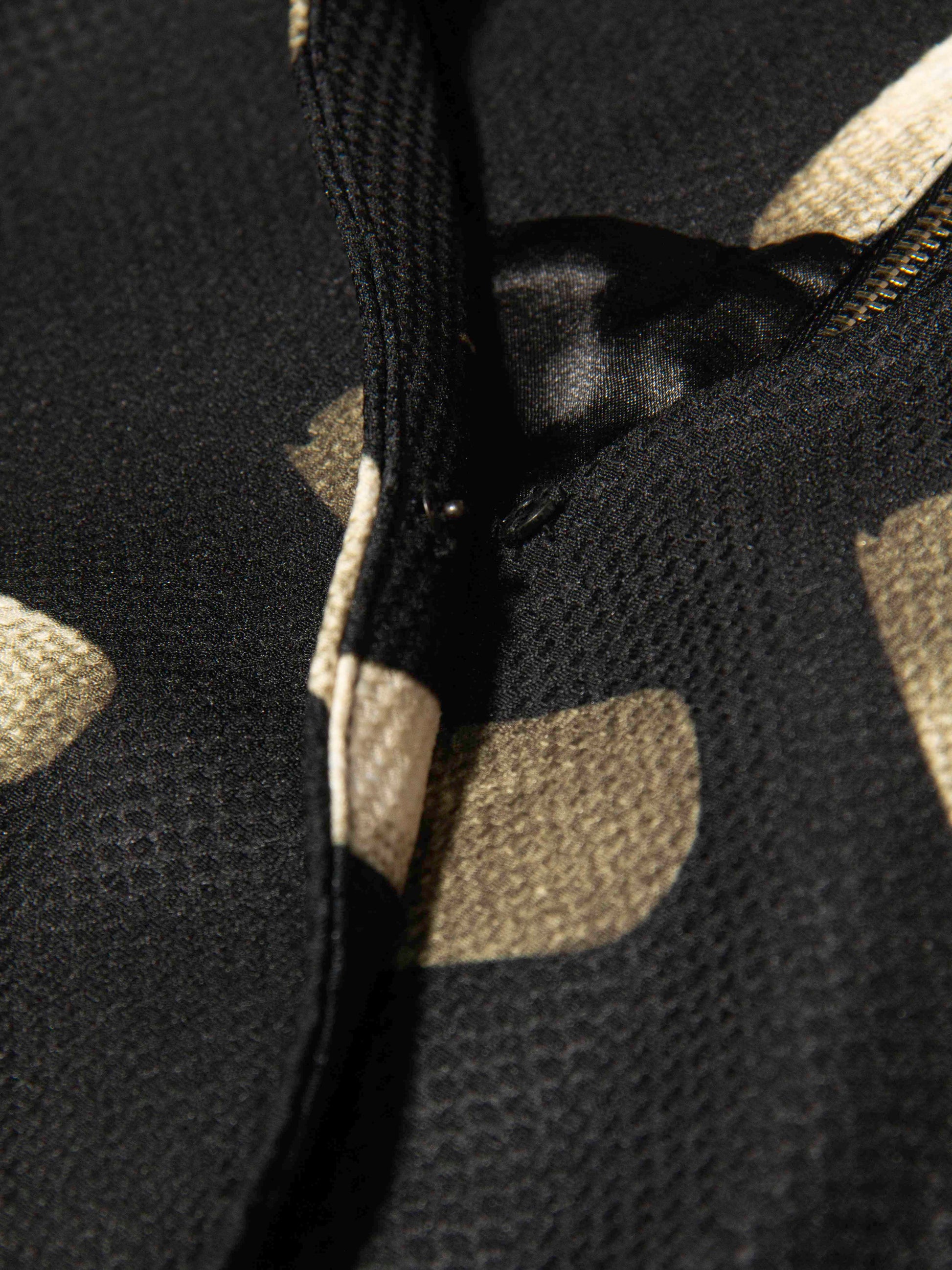 Details: Textured black fabric with metallic beige feather strokes and pleats on the skirt