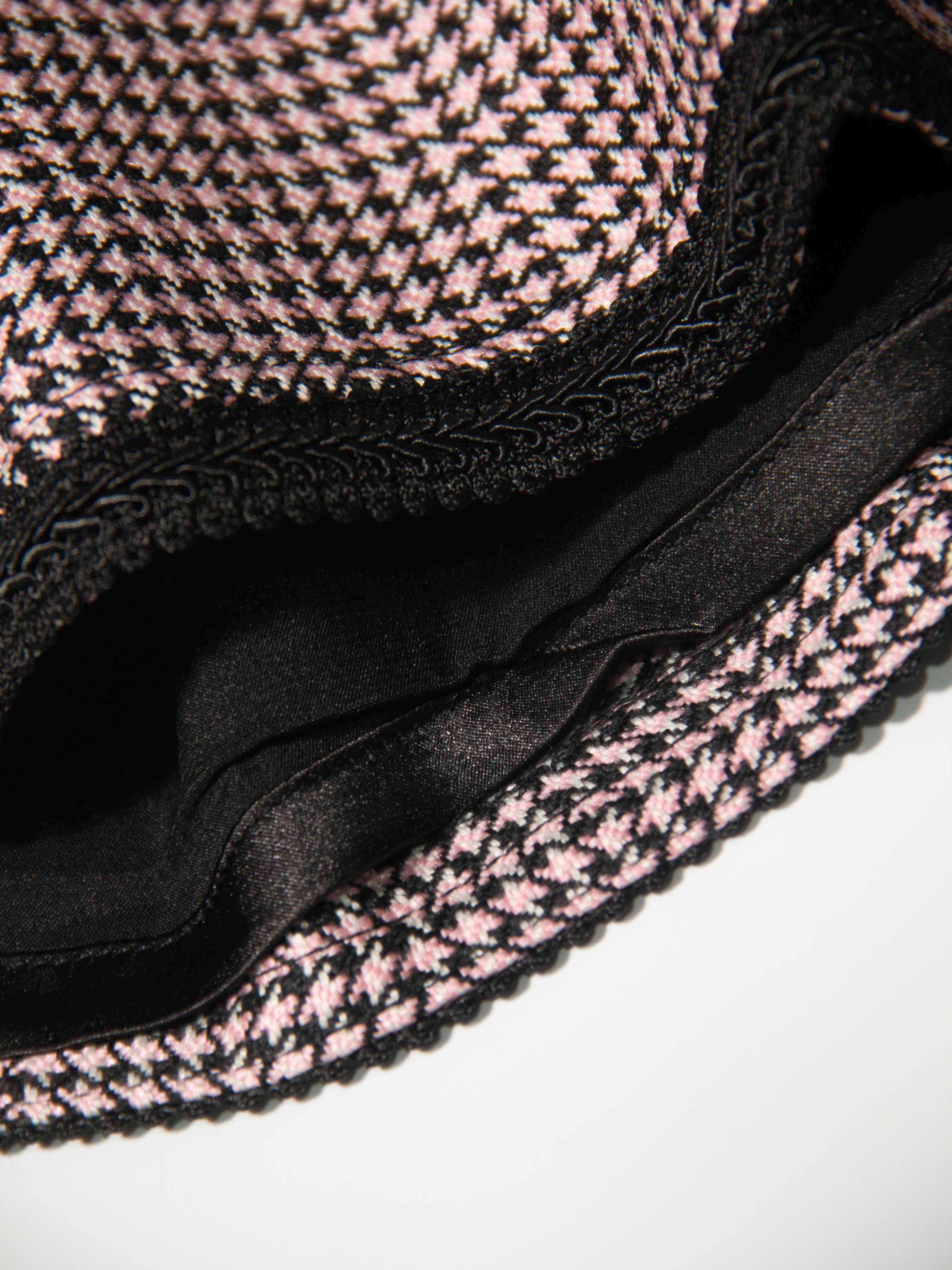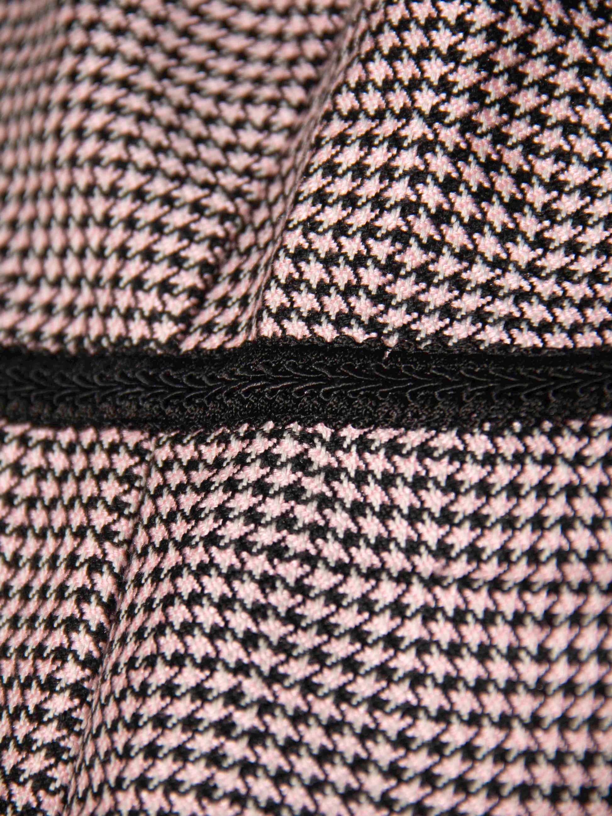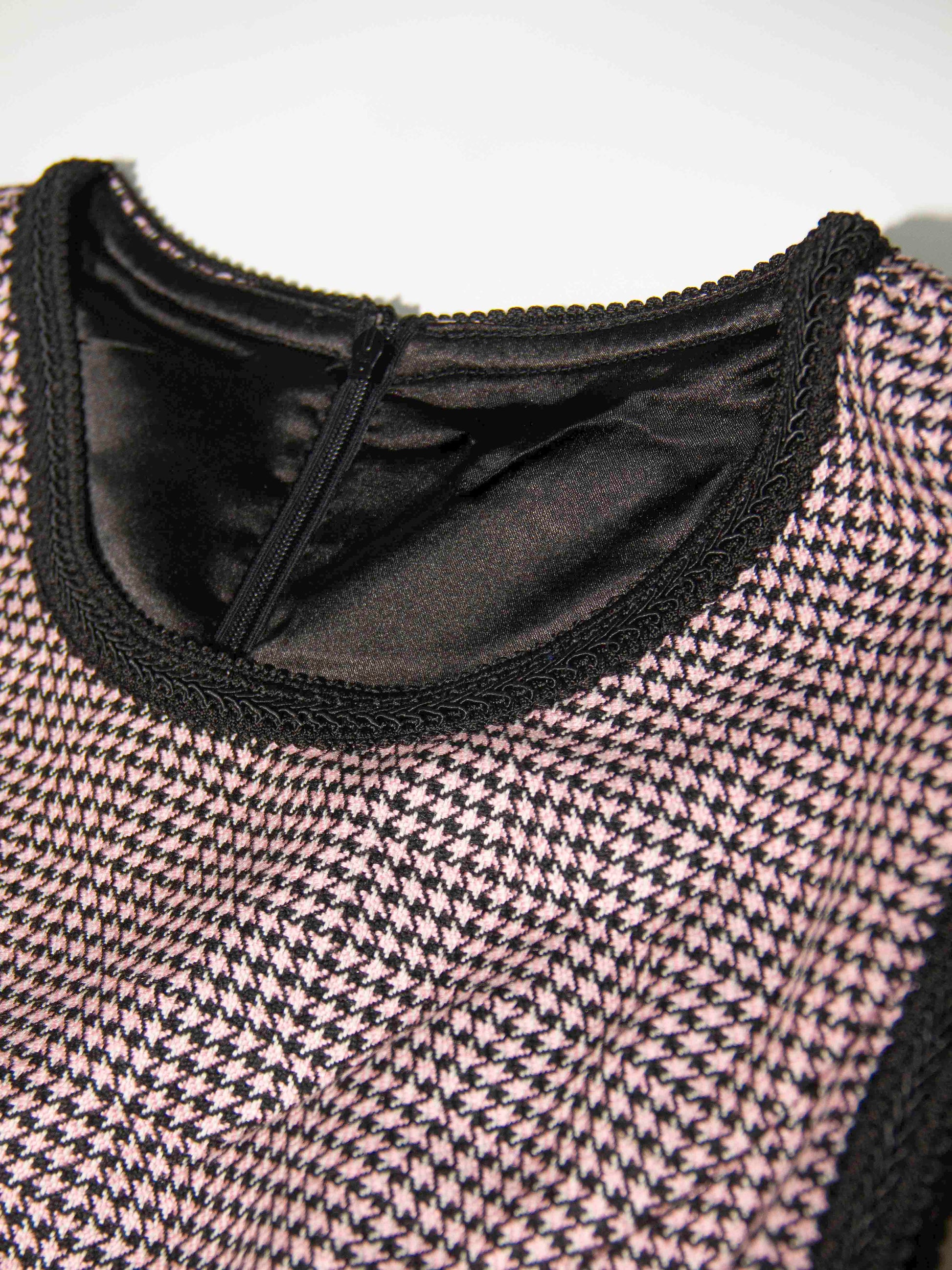Details: Micro houndstooth pattern in blush pink and black, framed with black edging on neckline, armholes, waist, and hem