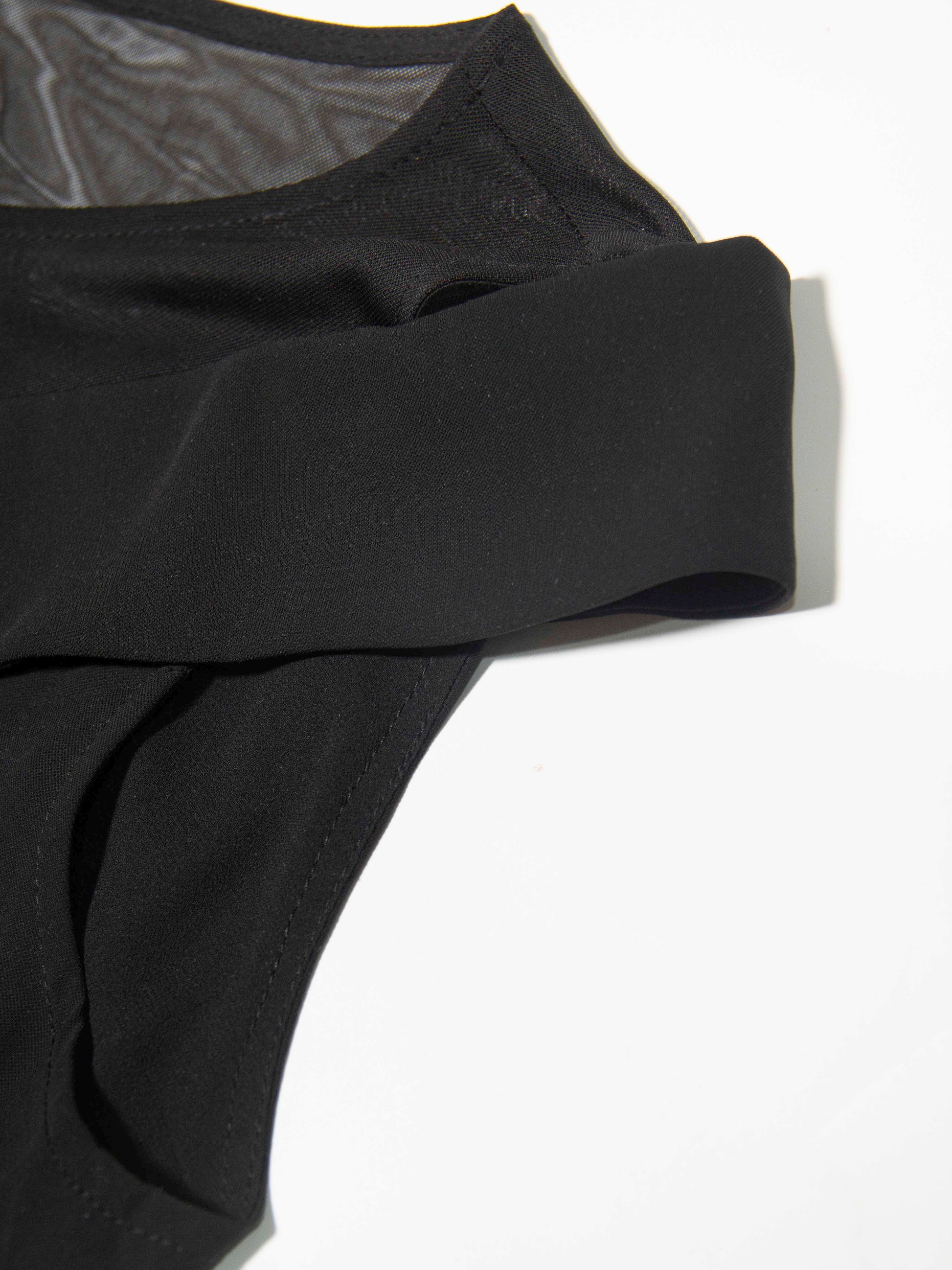 Neckline: Soft round illusion neckline in mesh, framed by a wide folded panel that highlights the shoulders and collarbone.