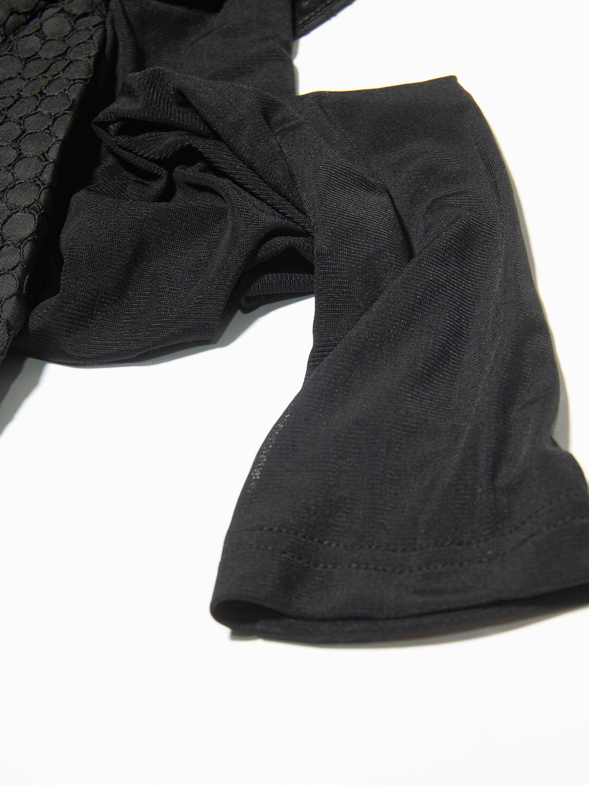 Sleeves: Full-length black knit sleeves for light coverage and comfort.