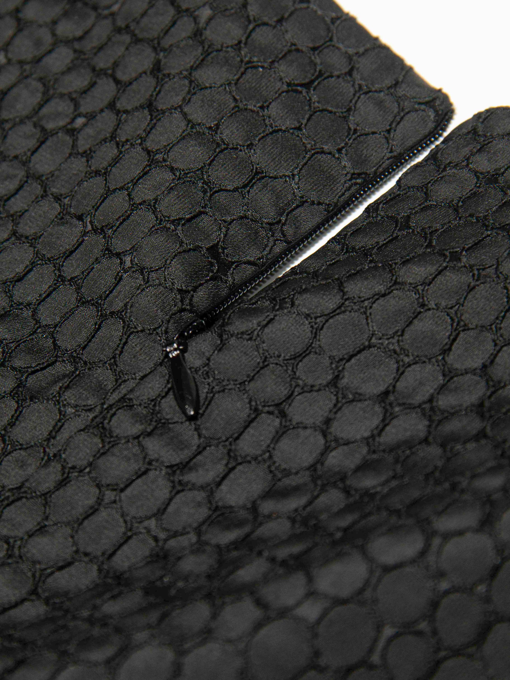 Details: Black honeycomb-textured top with neat front pleats and cobalt-and-black geometric skirt.