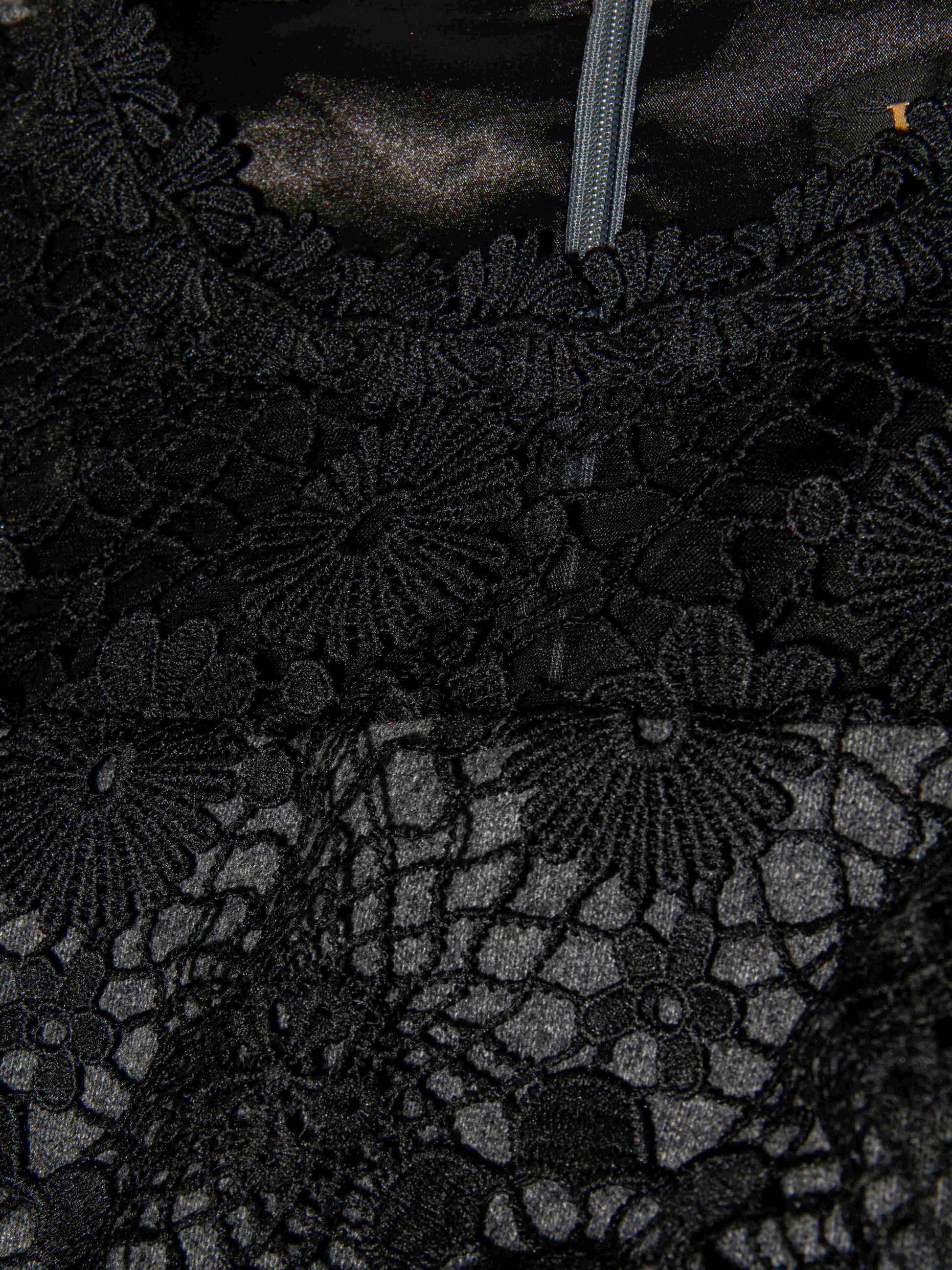 Details: Black floral lace overlay on the bodice with a scalloped hem that softly overlaps the skirt