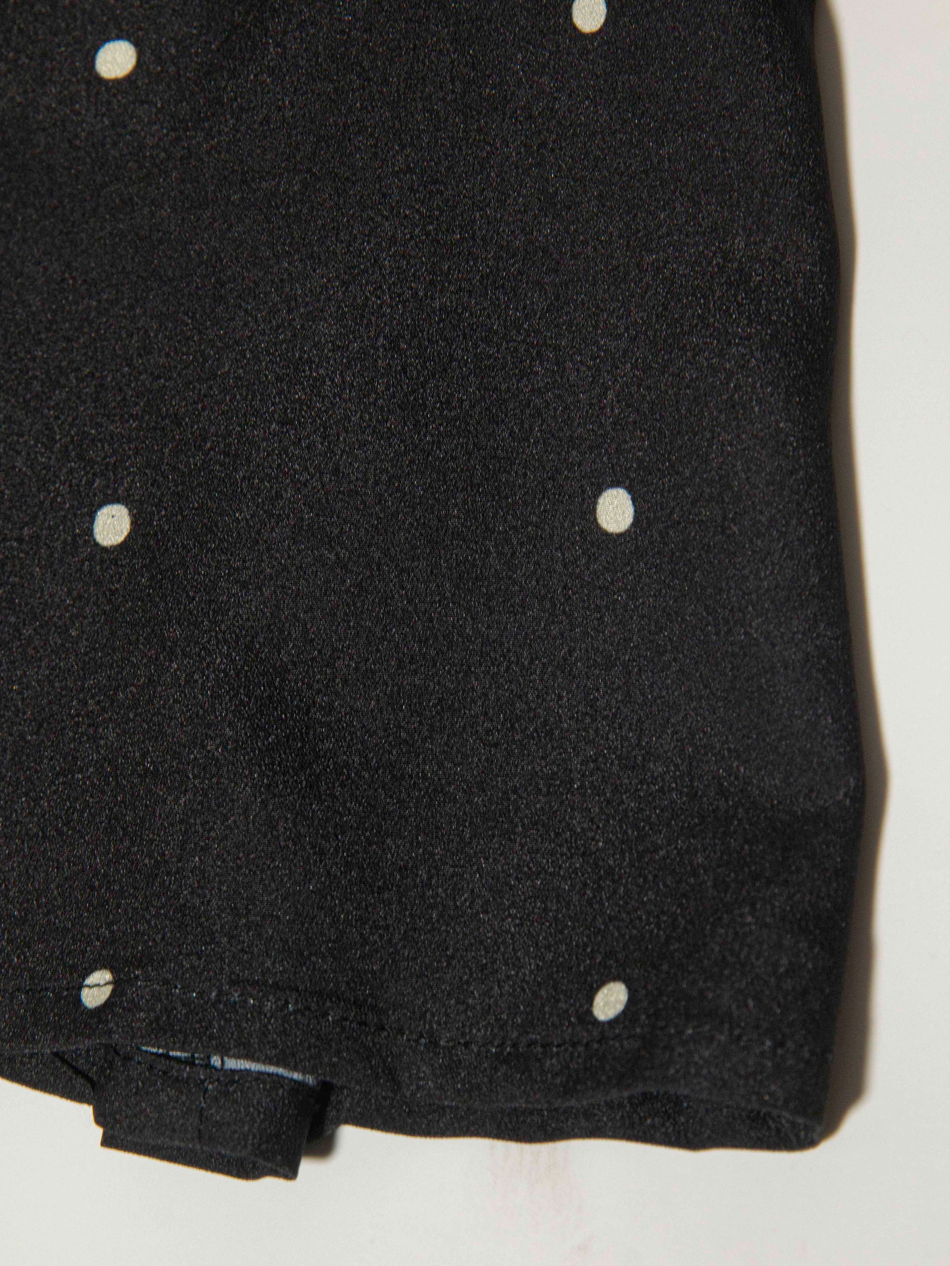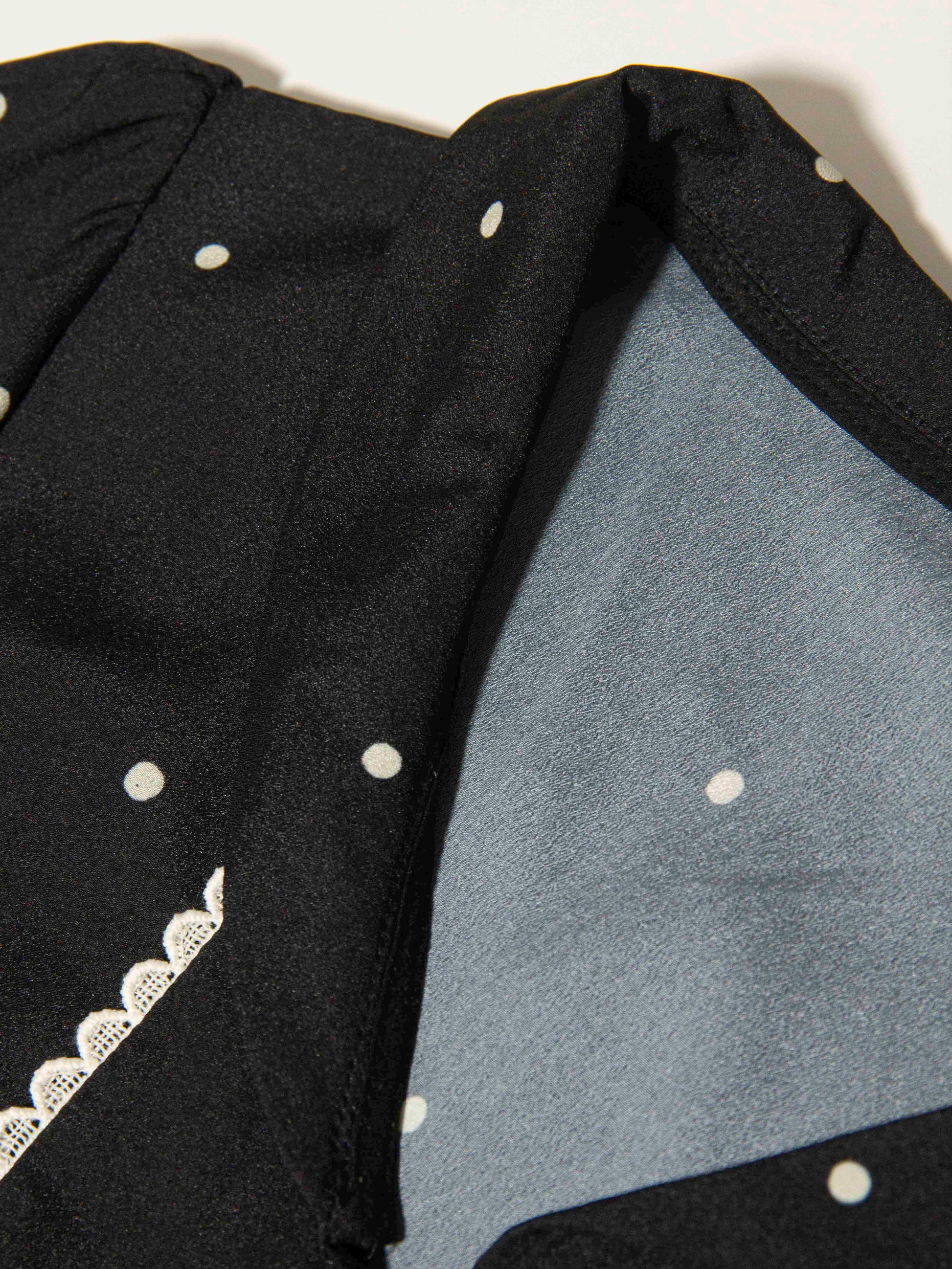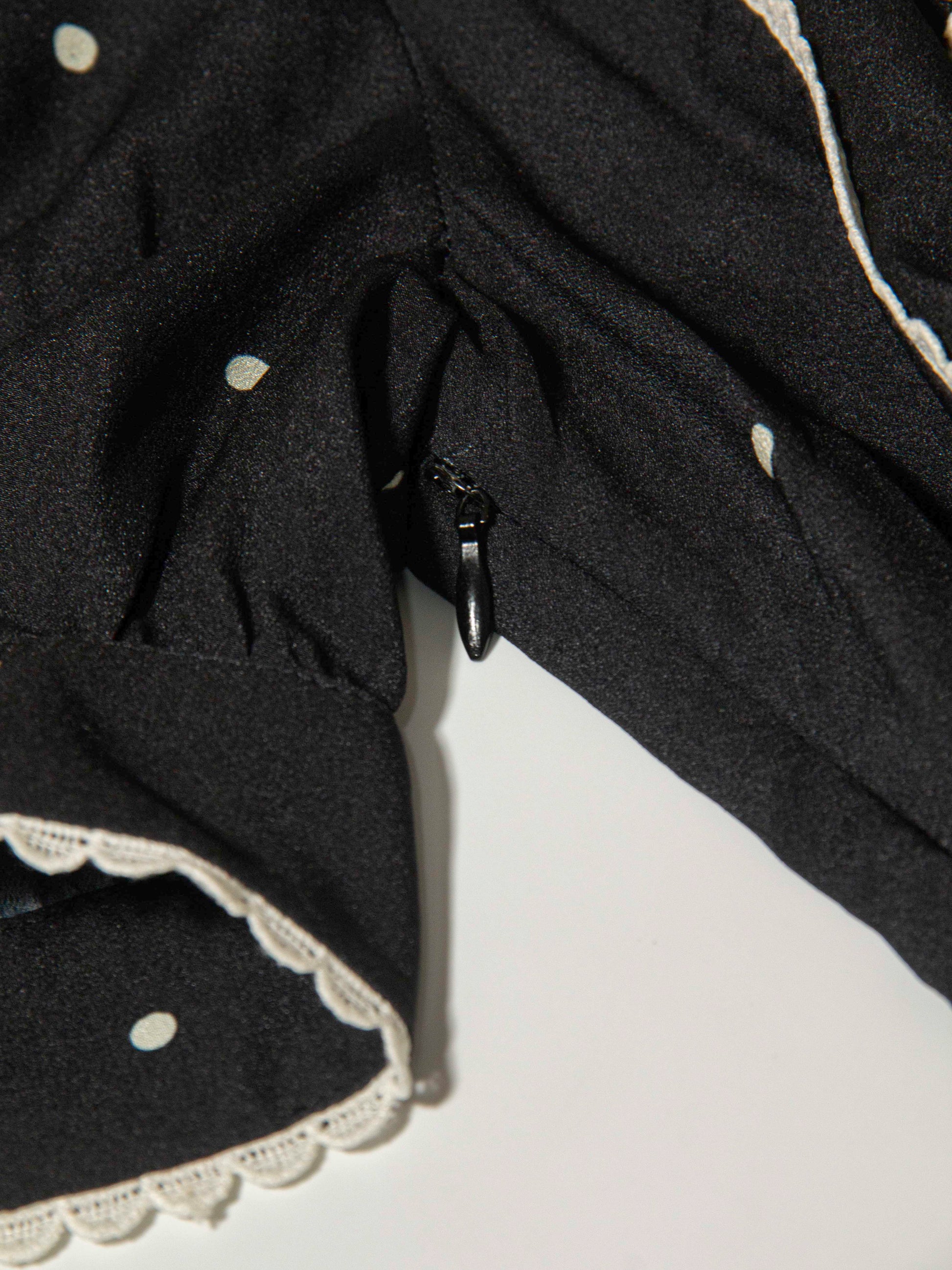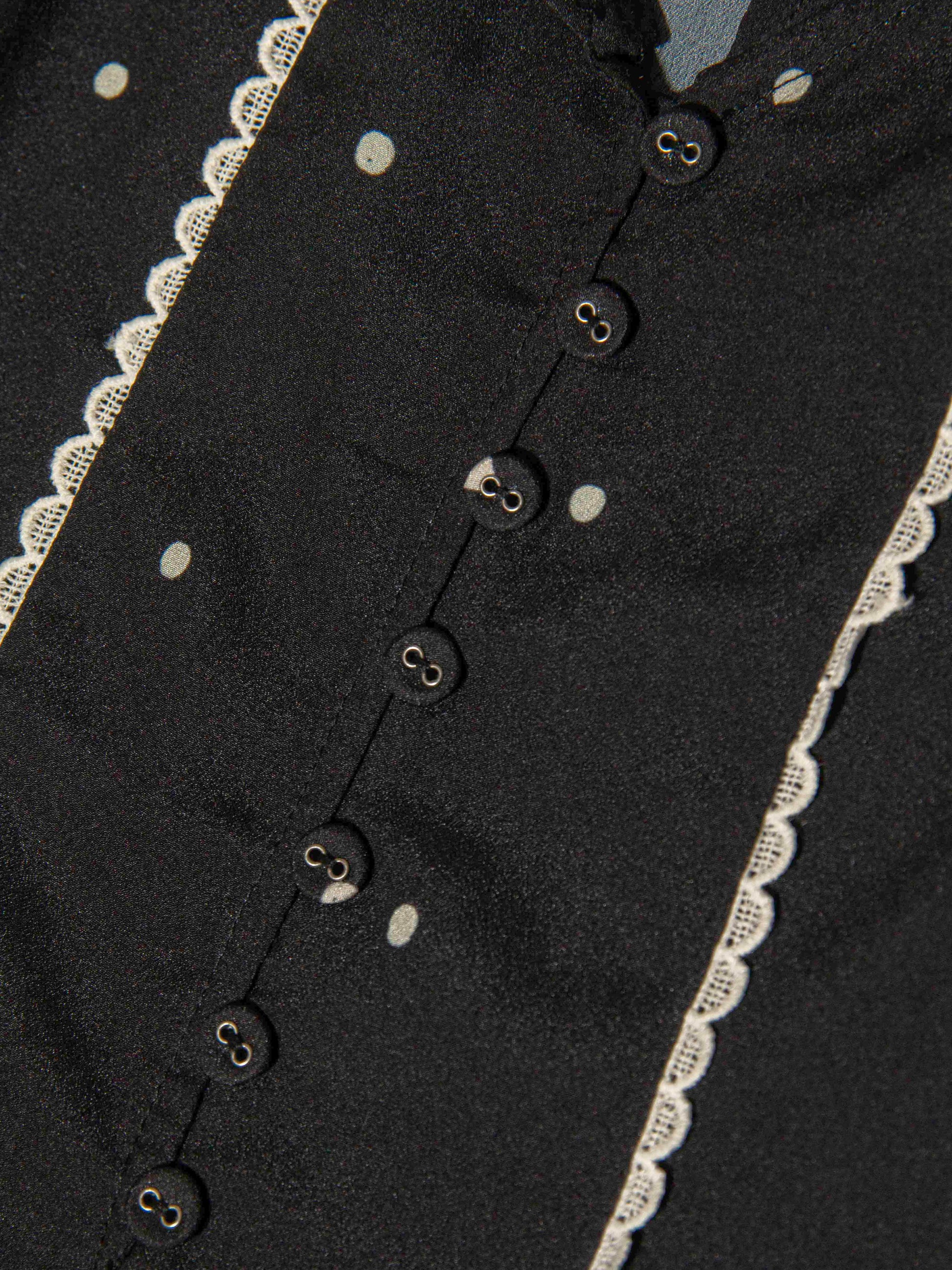 Details: Scattered dot print throughout, vertical lace-trim panels that visually slim the torso, and a row of covered buttons along the front for a feminine, tailored touch.