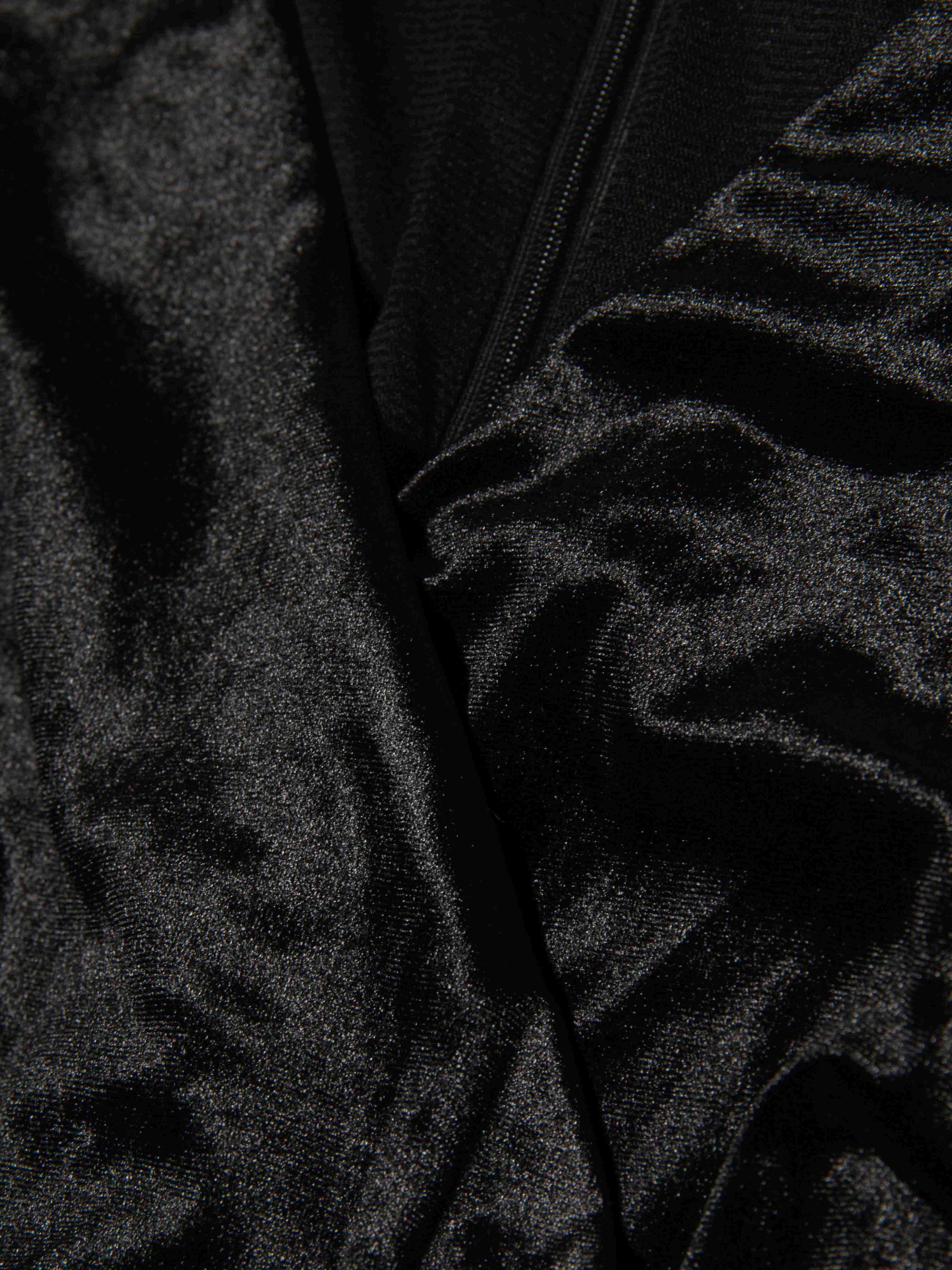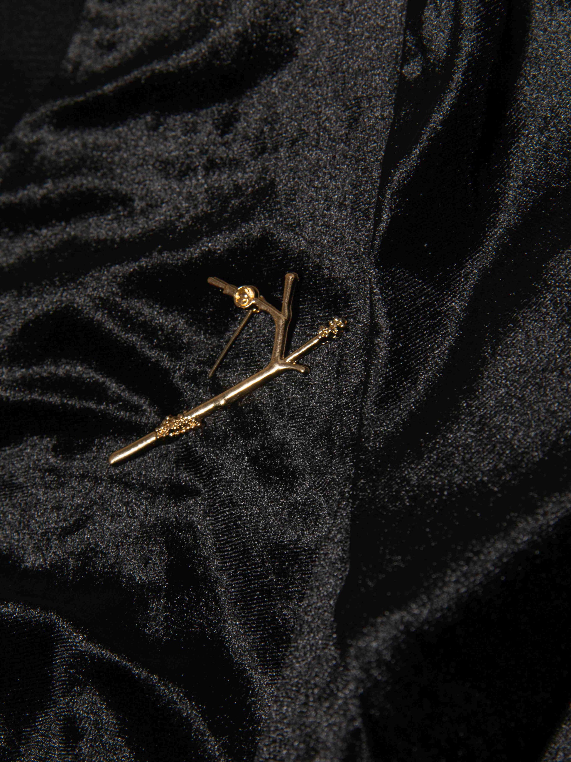 Details: Soft black velvet body with gentle draping and a removable gold branch brooch on the chest