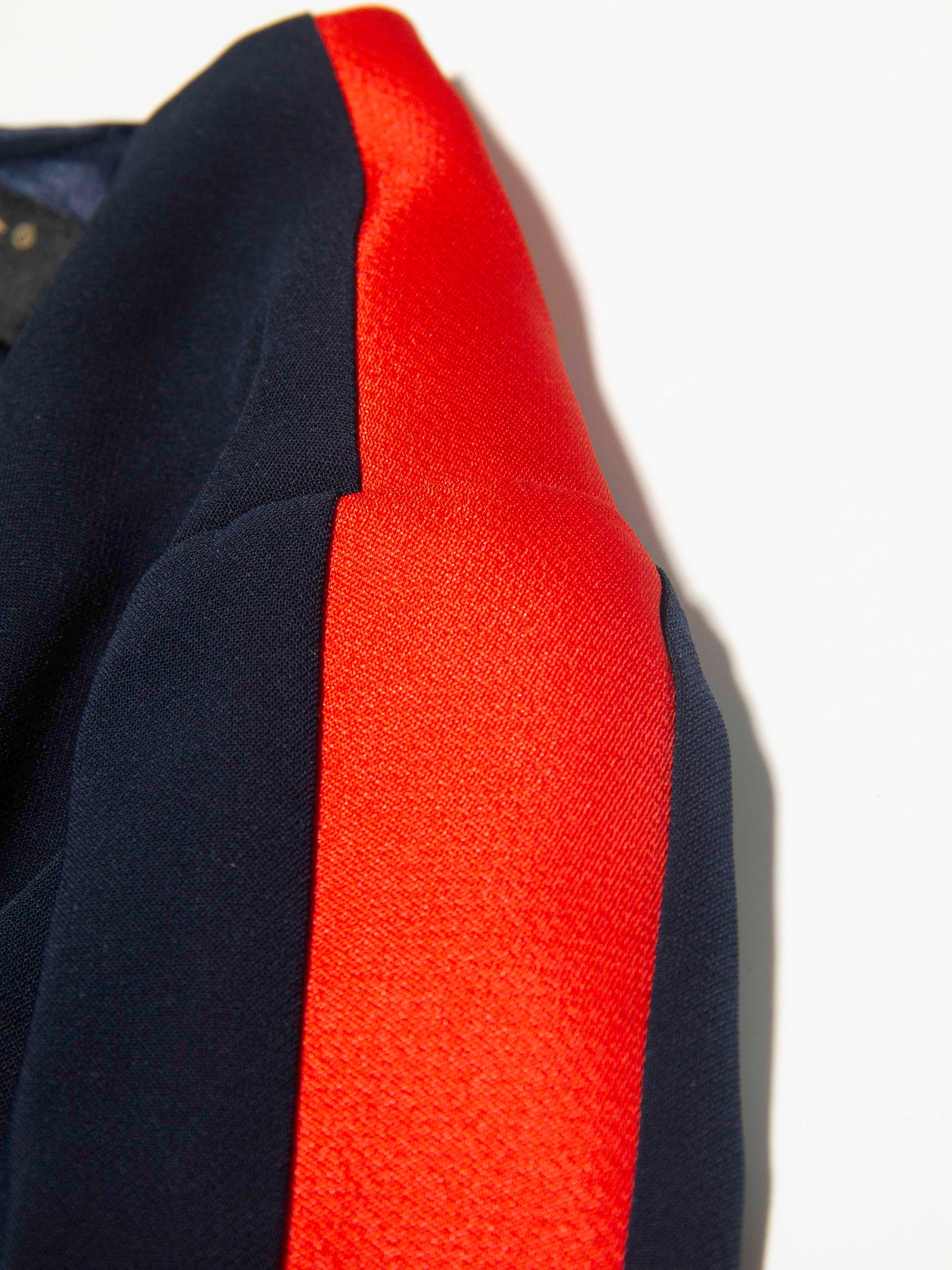 Details: Bold red panels from shoulder to hem that visually slim and elongate the body