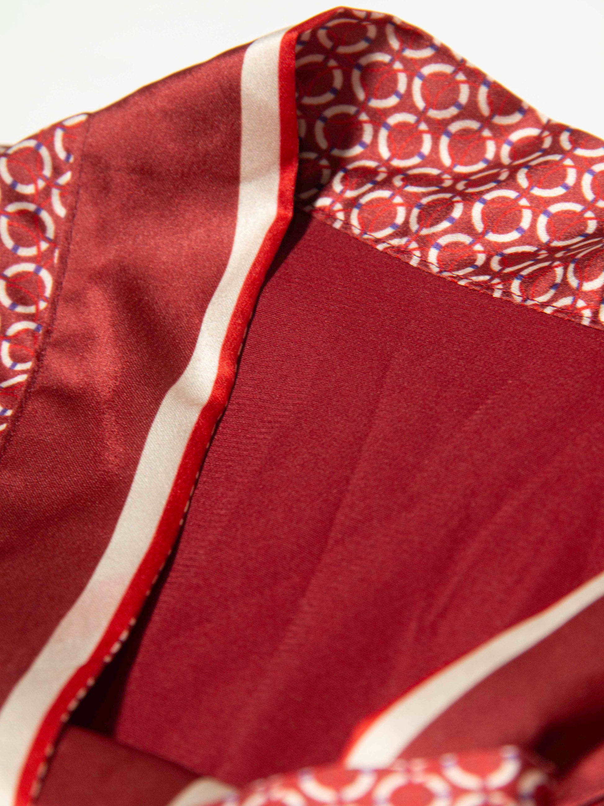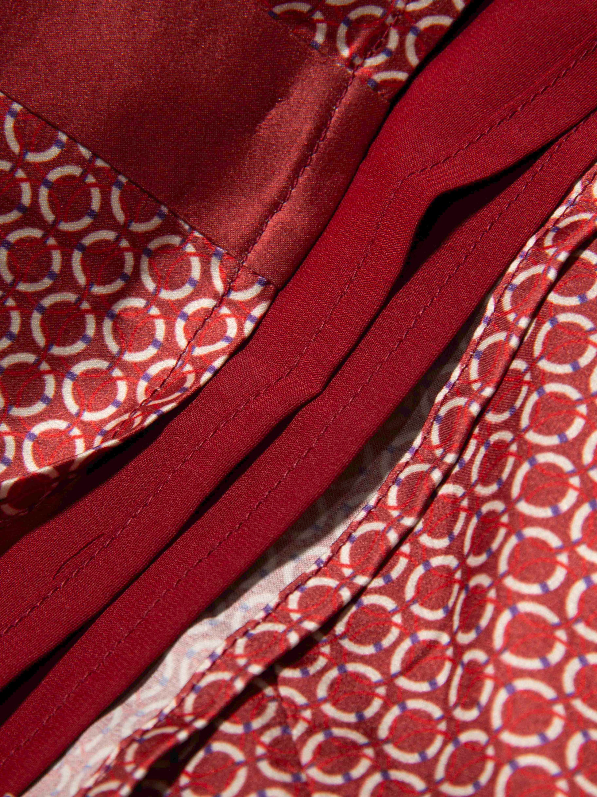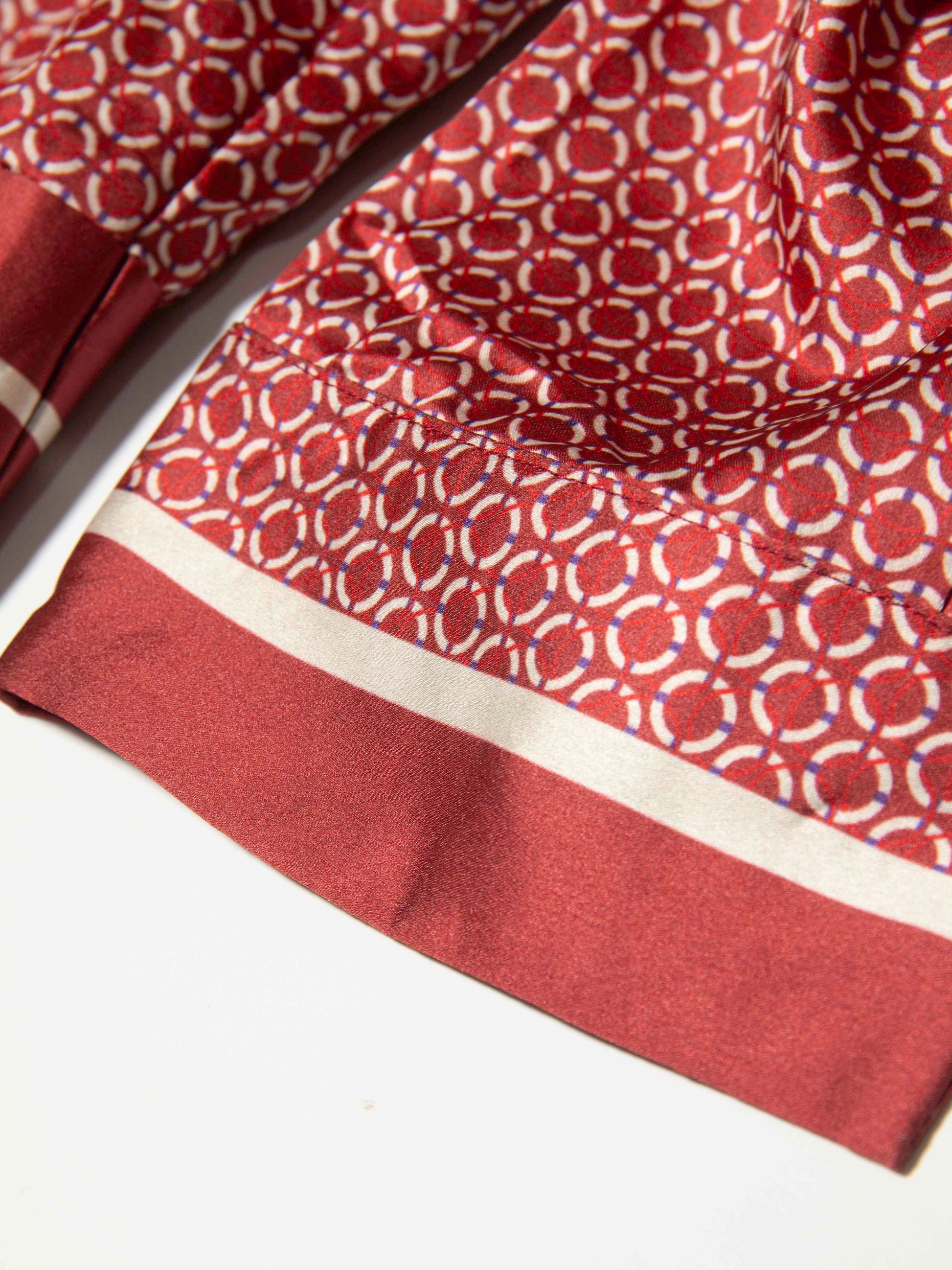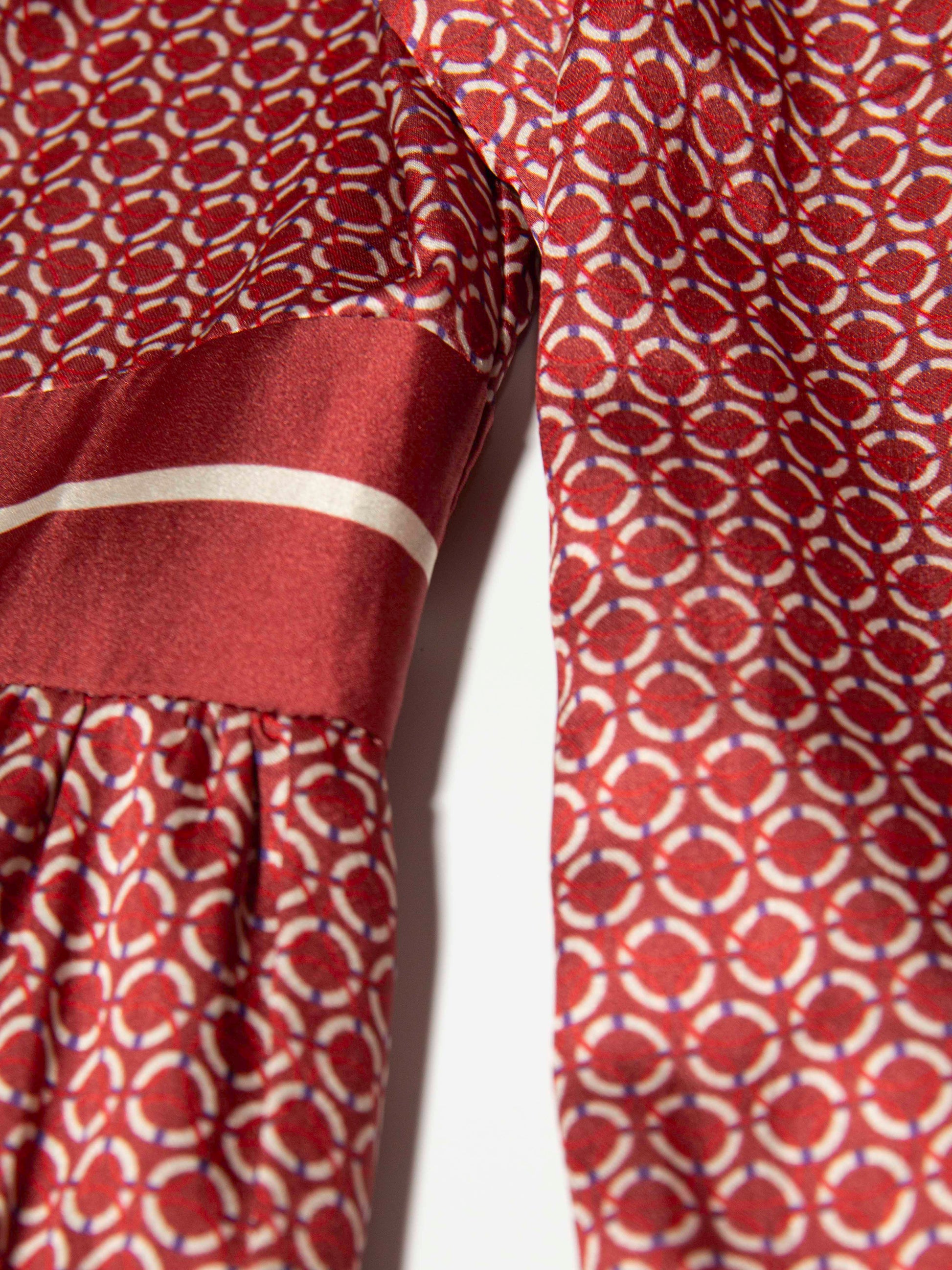 Details: Allover red geometric circle print with smooth satin trims along the placket, waist, and cuffs for a subtle, dressy contrast.