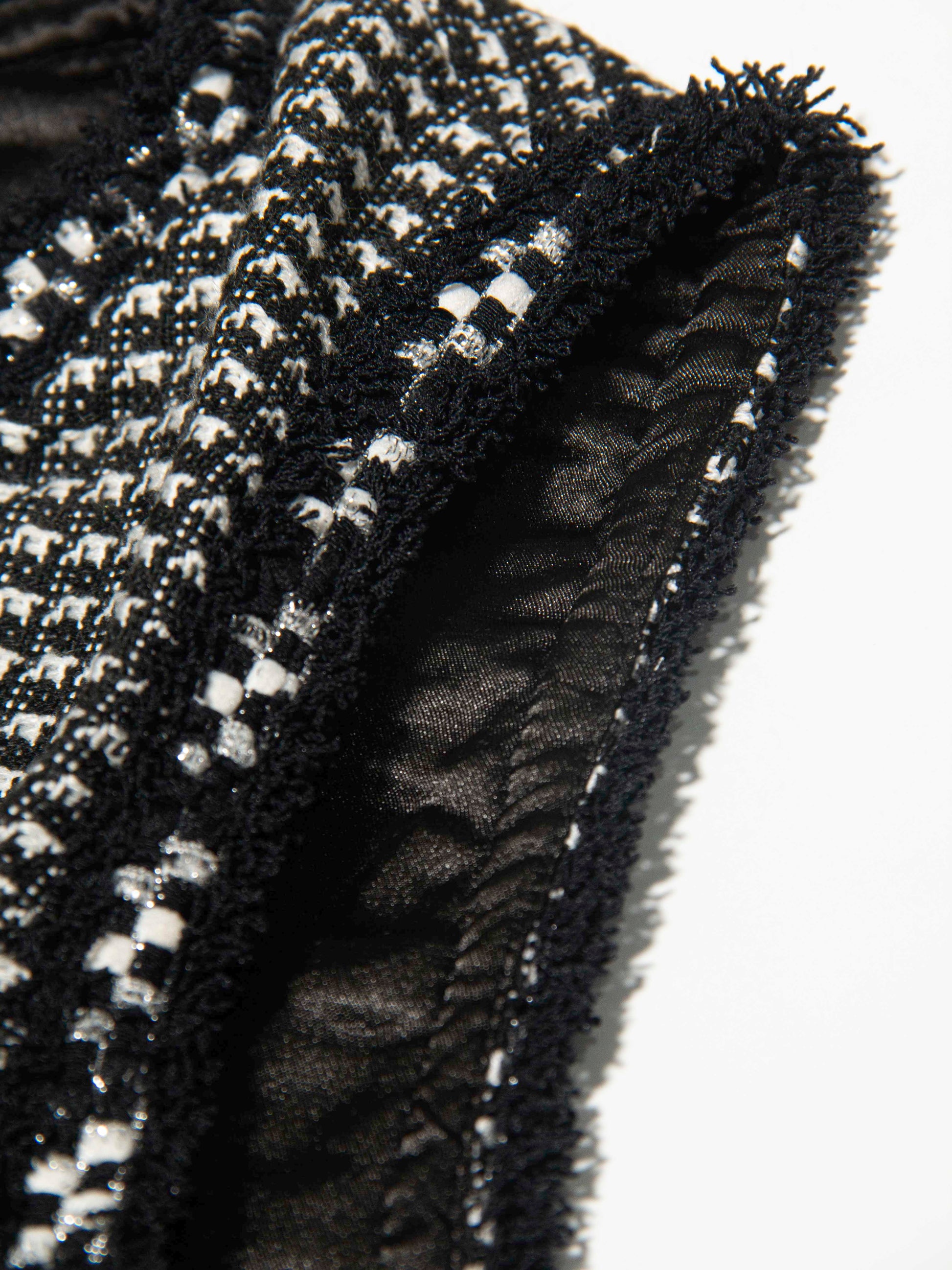 Style: Sleeveless fit-and-flare dress in a black-and-white tweed-style fabric with soft box pleats.
