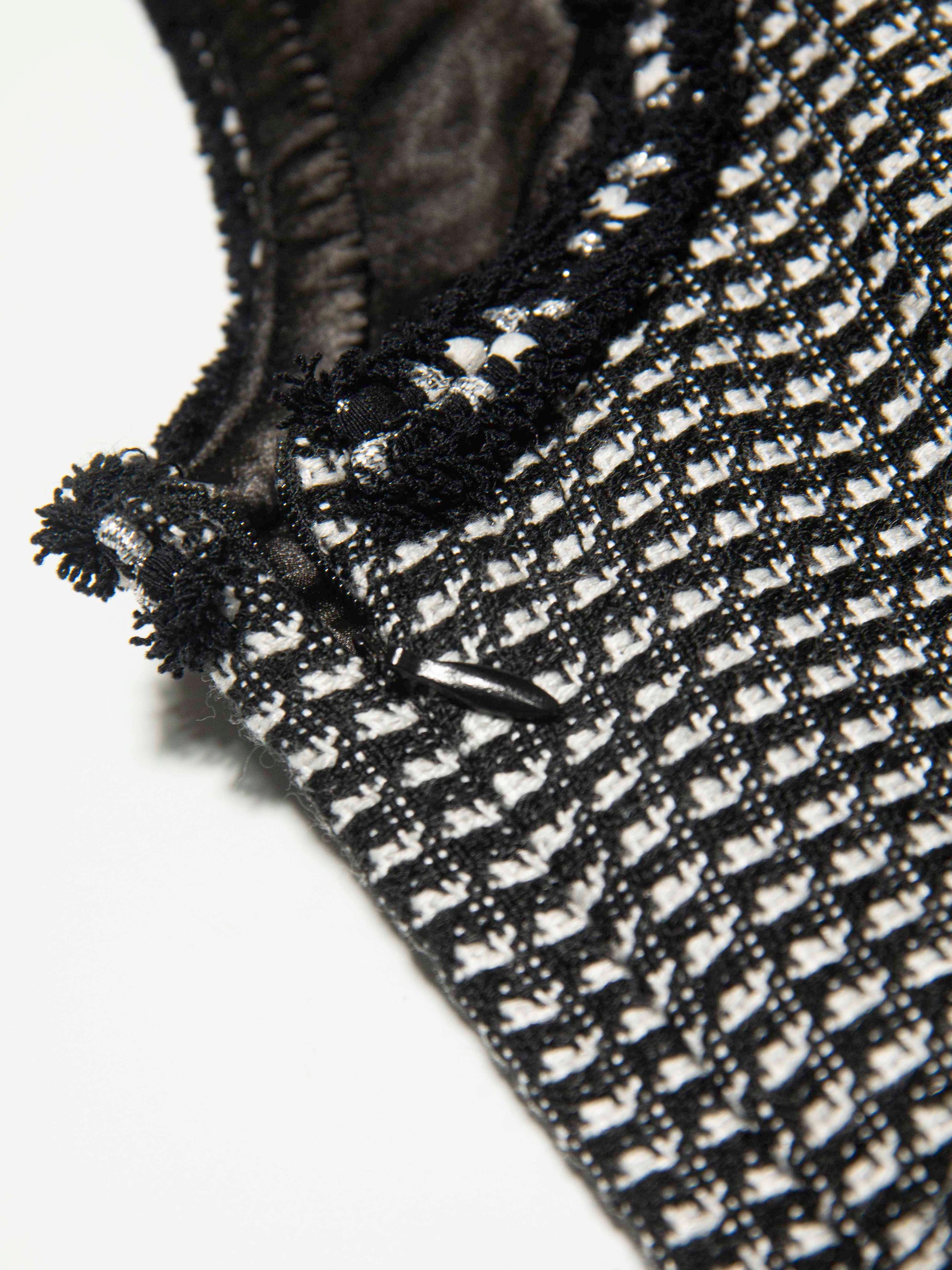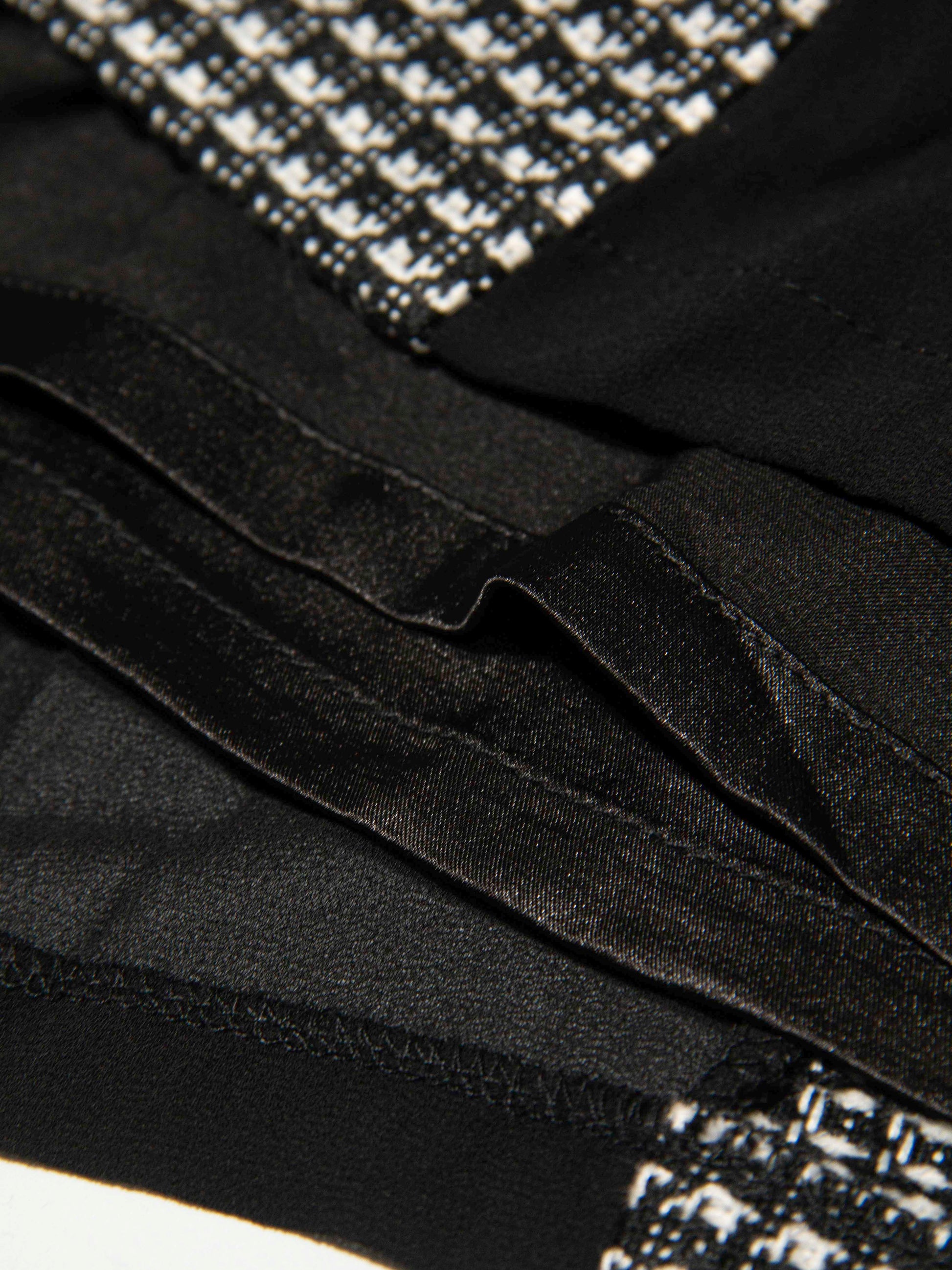 Details: Mini houndstooth pattern with a red rose embroidery on the chest, black lace-like trim at the waist, and contrast black pleat insets for subtle movement.