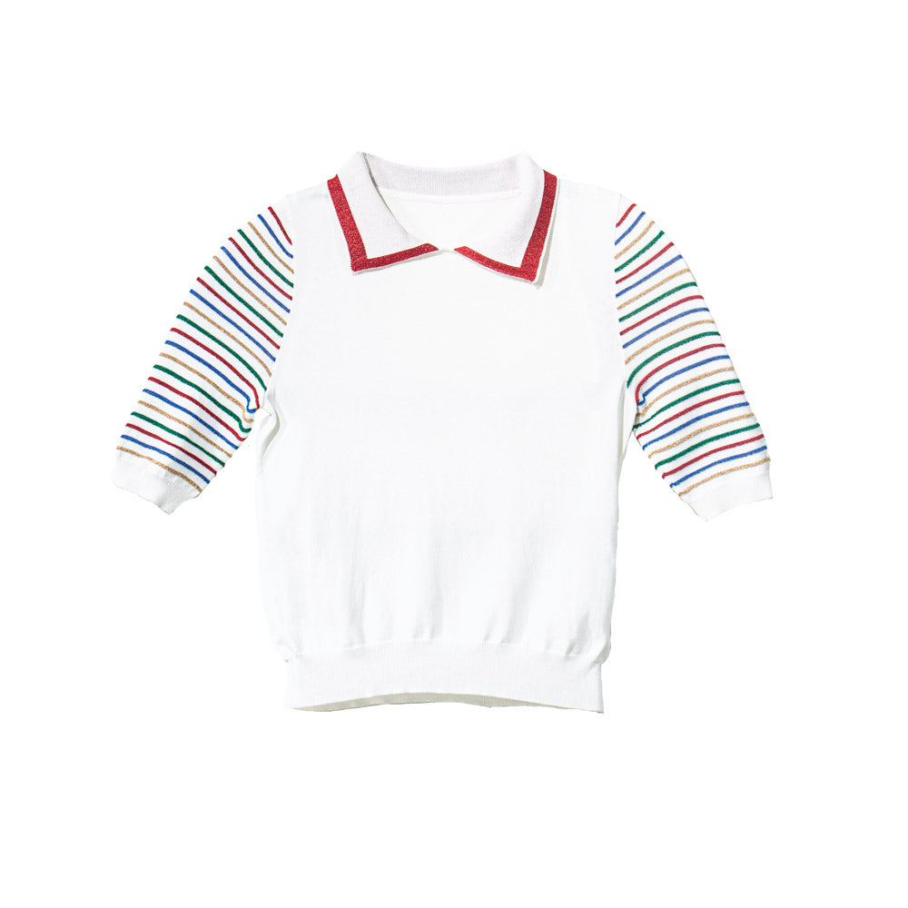 Colorful Textured Stripes: Features red, green, gold, and blue horizontal stripes that add playful vibrance to the outfit.